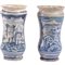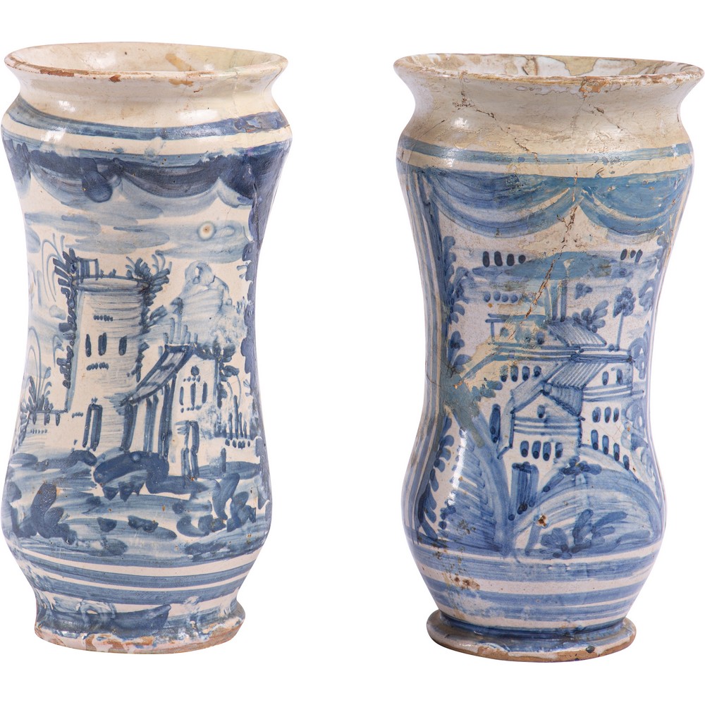 DUE ALBARELLI in maiolica policroma smaltata e decori raffiguranti "Paesaggi", uno presenta sul retro data 1816 (difetti ed incollature).