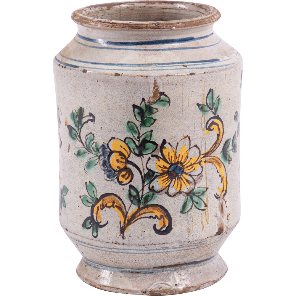 CILINDRO in maiolica policroma smaltata e decorata a motivi floreali (usure e mancanze).