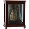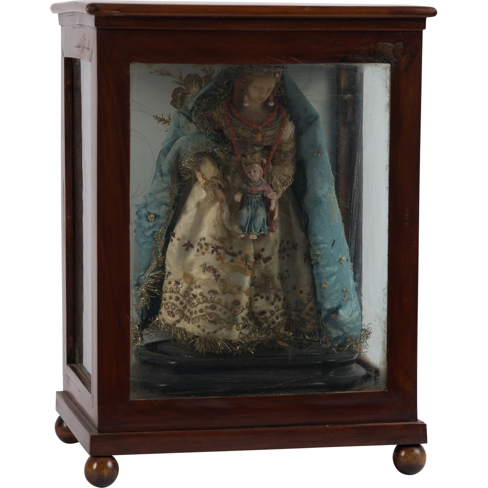 Madonna con bambino in cera con abiti ricamati a filo argentati e dorati, con collana e orecchini in corallo, entro teca in legno di mogano coeva (mancanze).