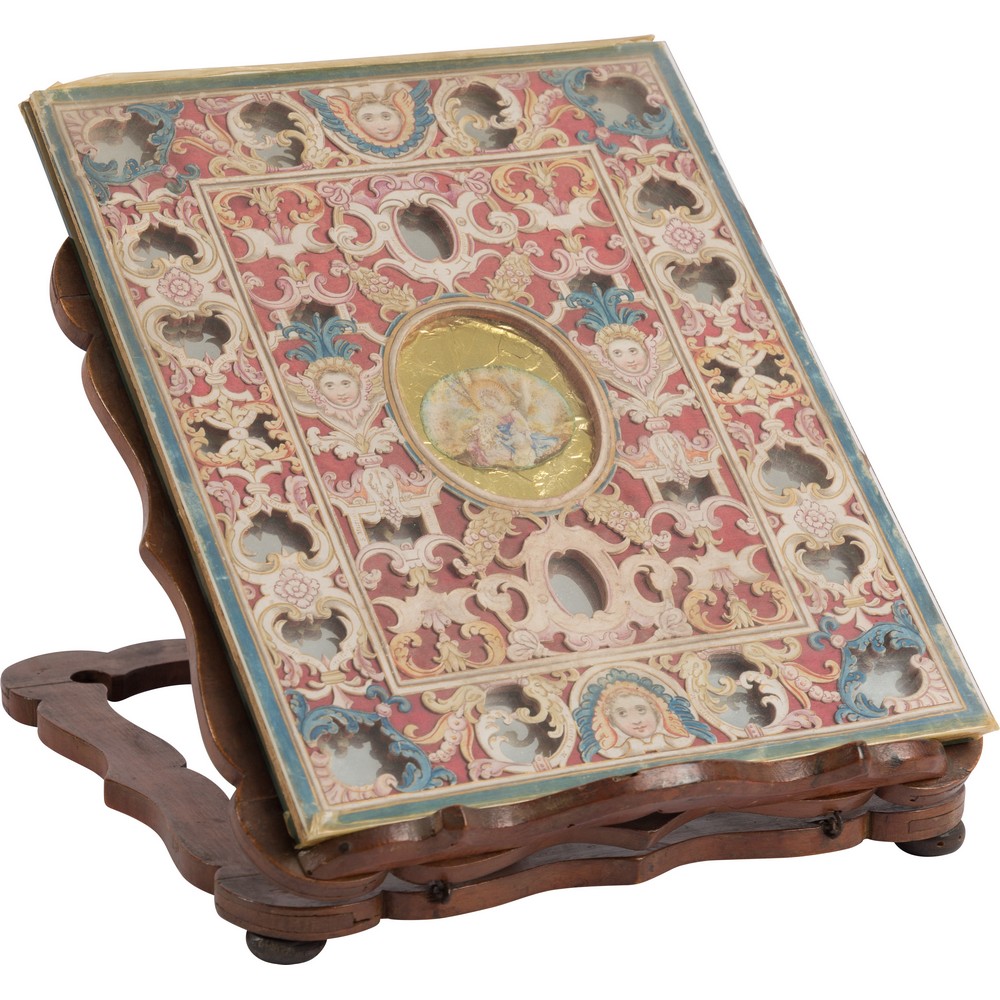 COMPOSIZIONE con miniatura "Madonna", su base a specchio, con leggio in legno.