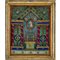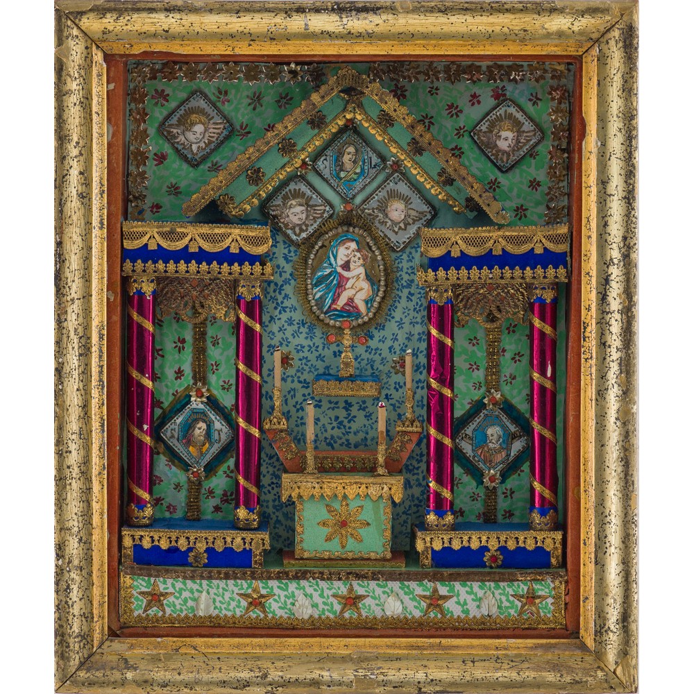 EDICOLA VOTIVA con altare e piccole miniature su carta dipinte a mano, pietre dure, perline e coralli, entro teca in legno dorato.