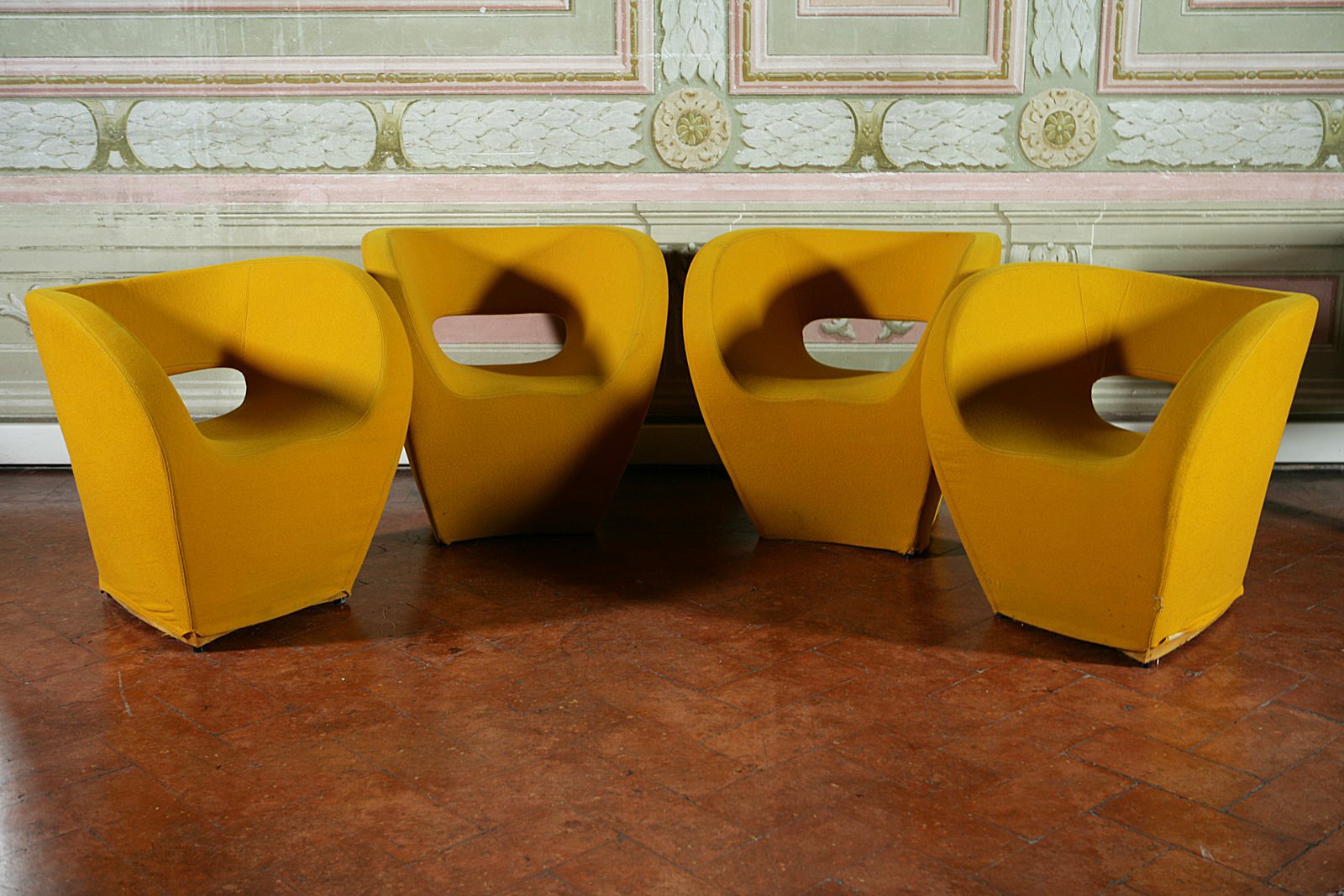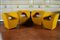 ARAD RON. Quattro poltroncine della serie 'Victoria and Albert ' per Moroso. Four armchairs of the 'Victoria and Albert' collection for Moroso. Cm 73x77x74. Struttura in acciaio , imbottitura di poliuretano espanso , copertura sfoderabile in cotone giallo. Steel frame, polyurethane foam padding, removable cotton yellow cover. 2000.
