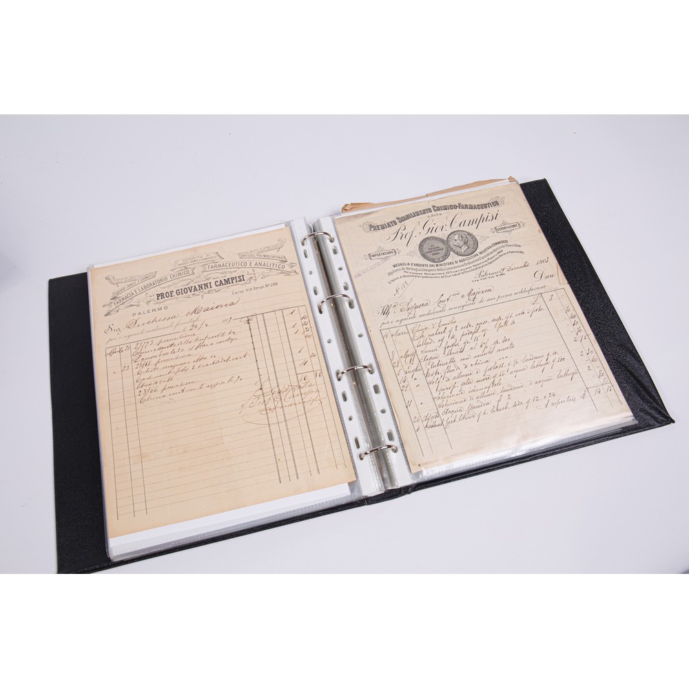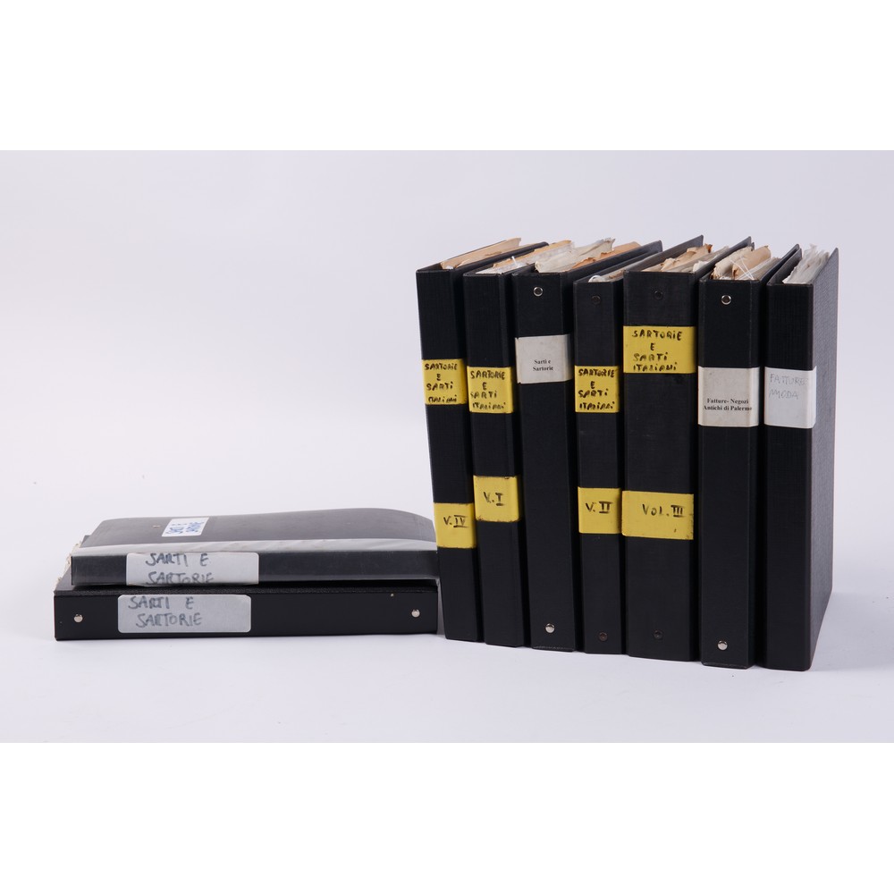NOVE RACCOGLITORI contenenti centinaia di fatture, ricevute, cataloghi, prezziari, inviti a esposizioni e documentazione varia relativa ai negozi di abbigliamento, sartorie, arredamenti, gioiellerie e altri sia a livello siciliano che nazionale ed internazionale, raccolte in decenni di ricerche. La raccolta, nella sua significativa selezione dei pezzi proposti, ancorchè non esaustiva, riesce comunque a dare uno spaccato della dinamica ed effervescente attività commerciale in Sicilia nel primo trentennio del ‘900.