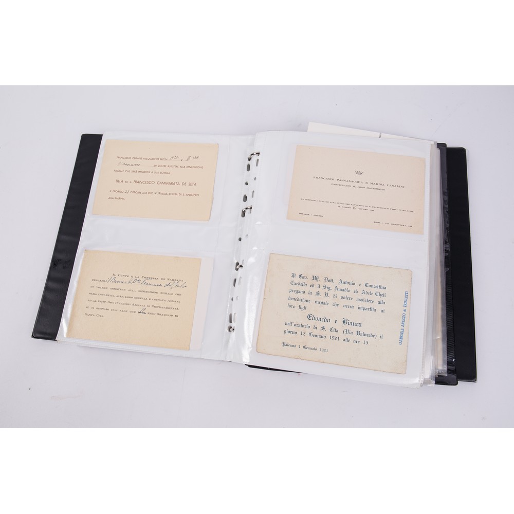 TRE RACCOGLITORI CONTENENTI INVITI A NOZZE e altri eventi del periodo fine XIX secolo inizi del XX secolo di famiglie nobiliari siciliane ed italiane. La raccolta si contraddistingue per la presenza di inviti relativi alle principali famiglie nobiliari e reali di Sicilia e d’Italia. Raffinati esempi di relazioni sociali, gli inviti presentano eleganti disegni, allegorie e stemmi impressi a rilievo in oro, a colori o addirittura disegnati a mano. Dare una scorsa ai presenti inviti e leggerne i cognomi, significa rievocare un mondo ormai perduto ma che ha dato vero lustro alla nostra Isola. I raccoglitori in plastica constano di centinaia di inviti, partecipazioni e biglietti di ringraziamento. Le carte sono in perfetto stato di conservazione.