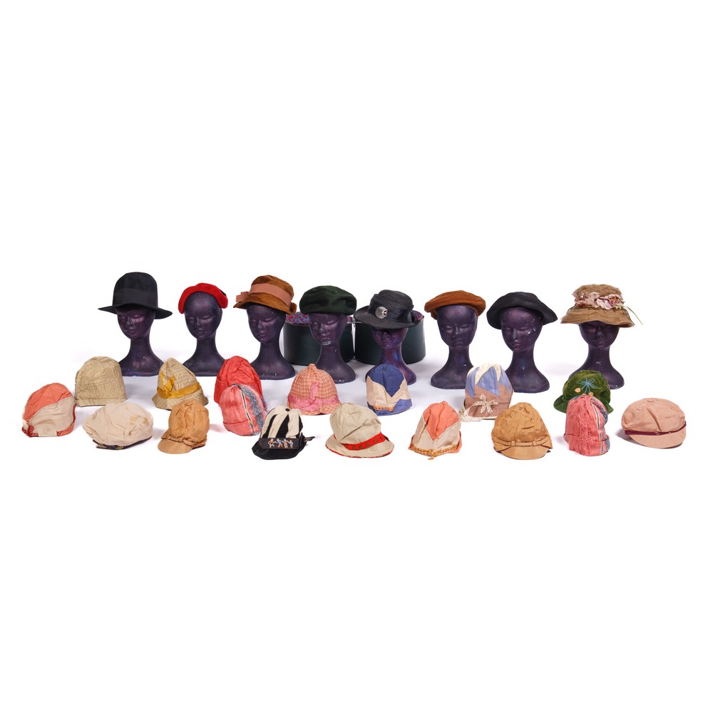 Una cappelliera contenente venticinque cappelli, diciassette da bimbo e bimba in tessuto di seta, panno e maglia di vario colore tipologia, otto da donna in panno, seta e paglia di diverso colore tipologia.