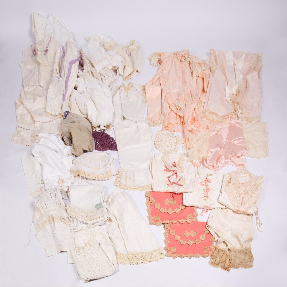 in cotone di colore diverso in seta, ricami, pizzi, nastri di raso; composto da undici camice; quattro camice da notte lunghe; cinque completi; due sacchetti in velluto porta biancheria; sette mutandoni; tre cuffie in cotone ricamate per la notte.