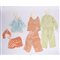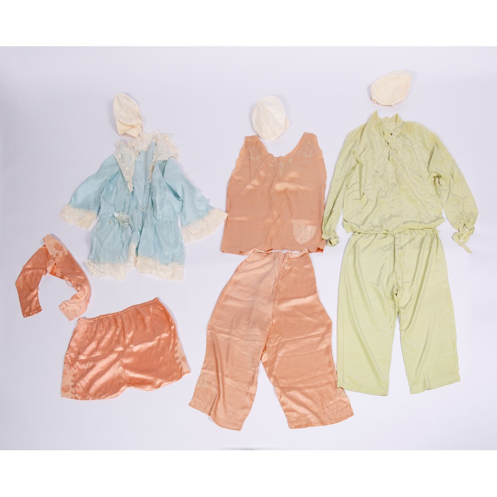Un completo da notte composto da pantalone e camicia in seta con ricami nei toni del verde, un completo da notte con pantalone e canottiera in seta colore rosa antico, un completo da notte composto da culotte e canottiera. Tre cappelli da notte in tessuto bianco.