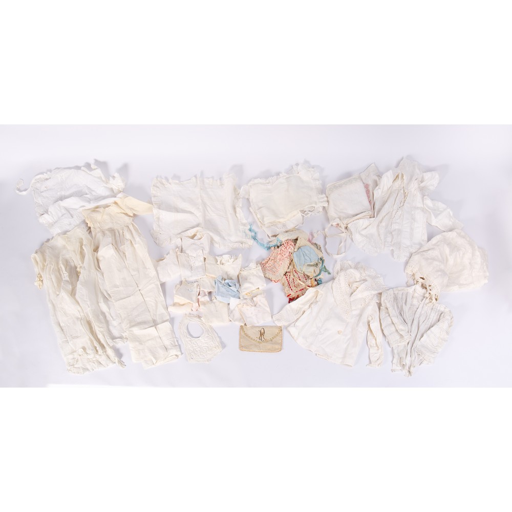 di diverso tessuto e colore ,ricami e pizzi; tre giacchini, undici cuffie una barbetta, due fasciatoi, diciotto camicie, due grembiuli, tre federe per culla, tre porta porte-enfat, un battesimale, una busta per indumenti.