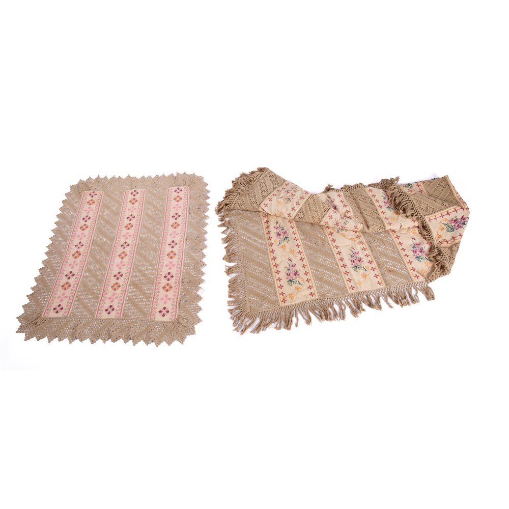 Un copriletto matrimoniale in tela ricamata con violette e fasce verticali, bordura ricamate all’uncinetto nei toni ecrù. Una copertina per culla in tela ricamata fiori rosa e fasce e bordura all’uncinetto nei toni ecrù.