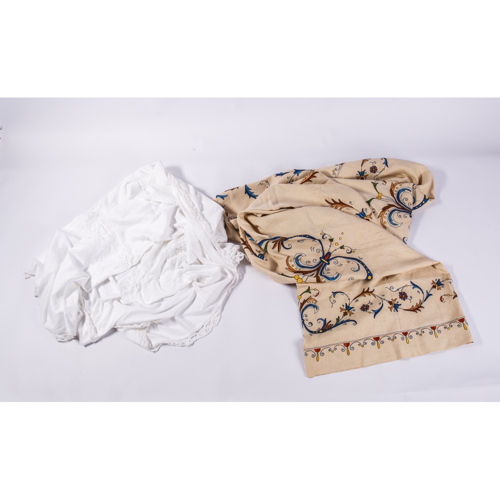Trentaquattro capi di corredo, due copriletto uno ricamato in cotone bianco e uno in misto lino ecrù con ricami colorati, diciassette tra federe e copri federe, otto federe con ricami, e sette lenzuola.