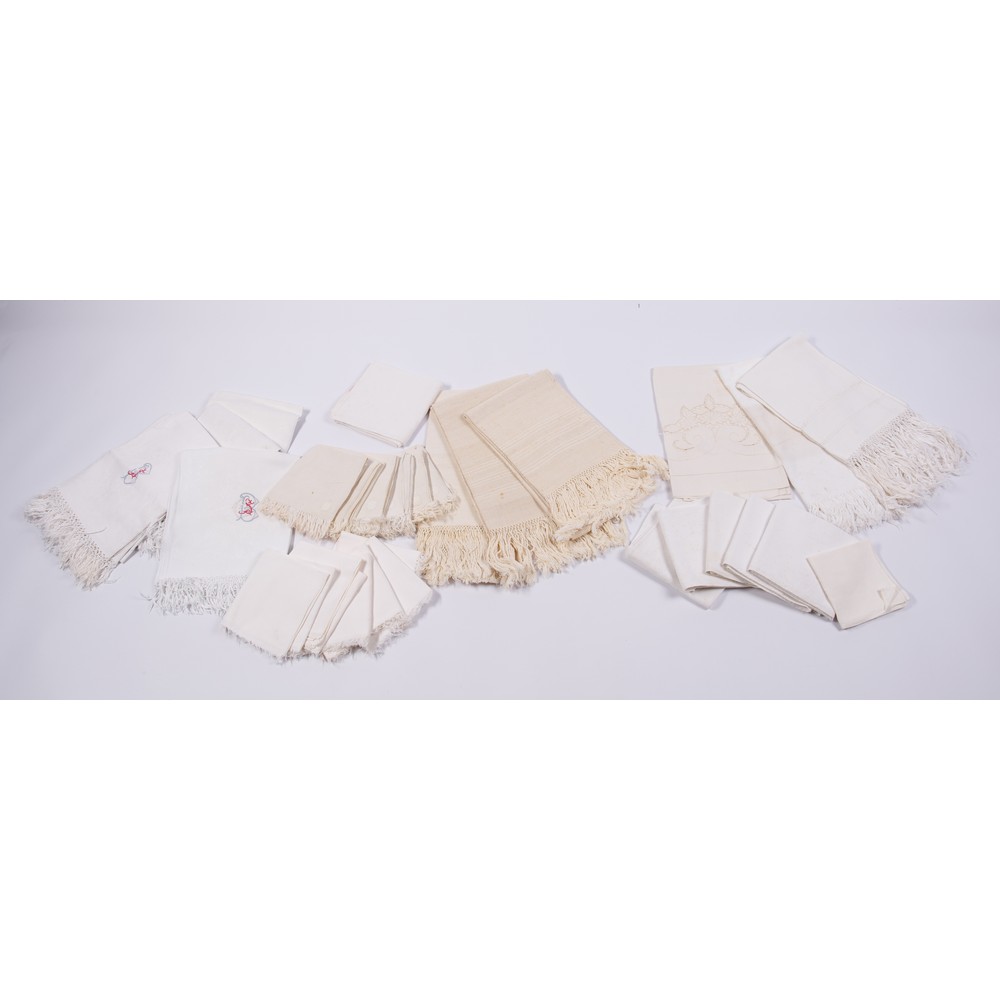 Una raccolta di trentuno asciugamani in fiandra di cotone e lino, alcune con iniziali ricamate e frange.