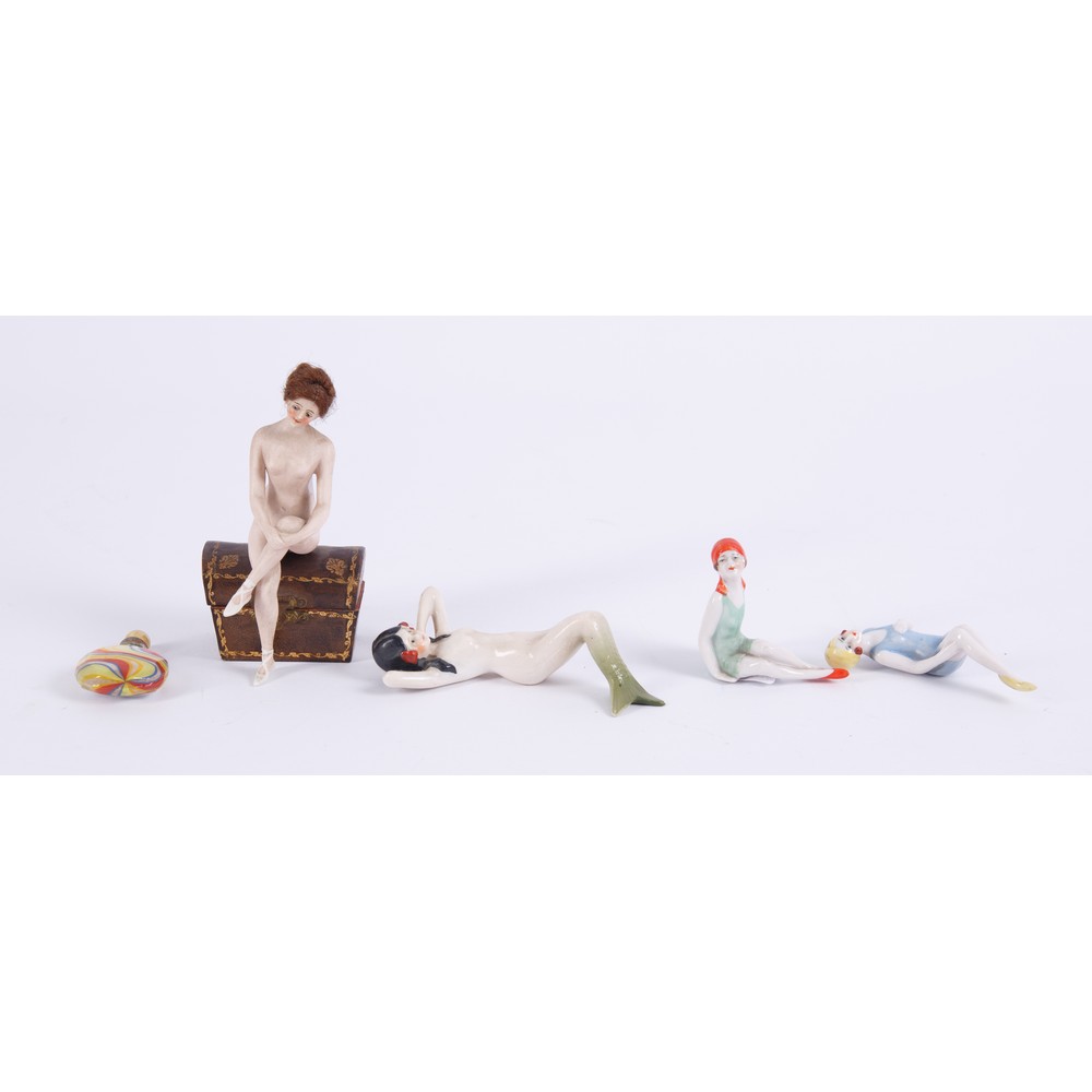 Scultura raffigurante 'Sirena', tre sculture in porcellana 'Figure femminili al bagno' e piccola bottiglia in vetro policromo.