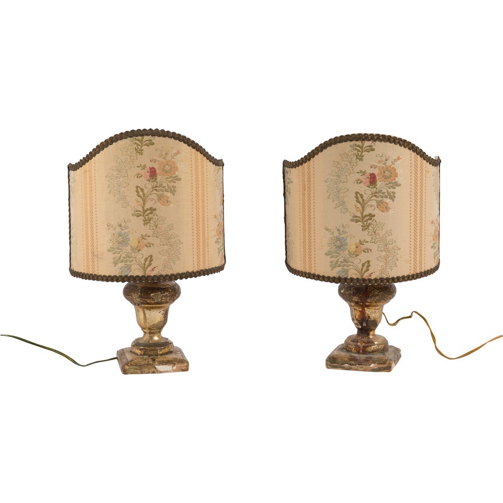 trasformati a lumetti in legno dorato, argento e mistura con ventole in tessuto decorato.