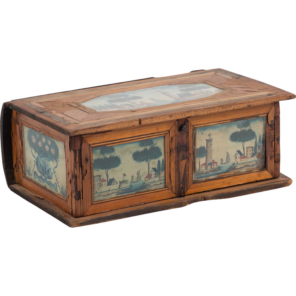 PORTAGIOIE in legno con miniature su carta raffiguranti “Paesaggi”, con bordura a finto libro.