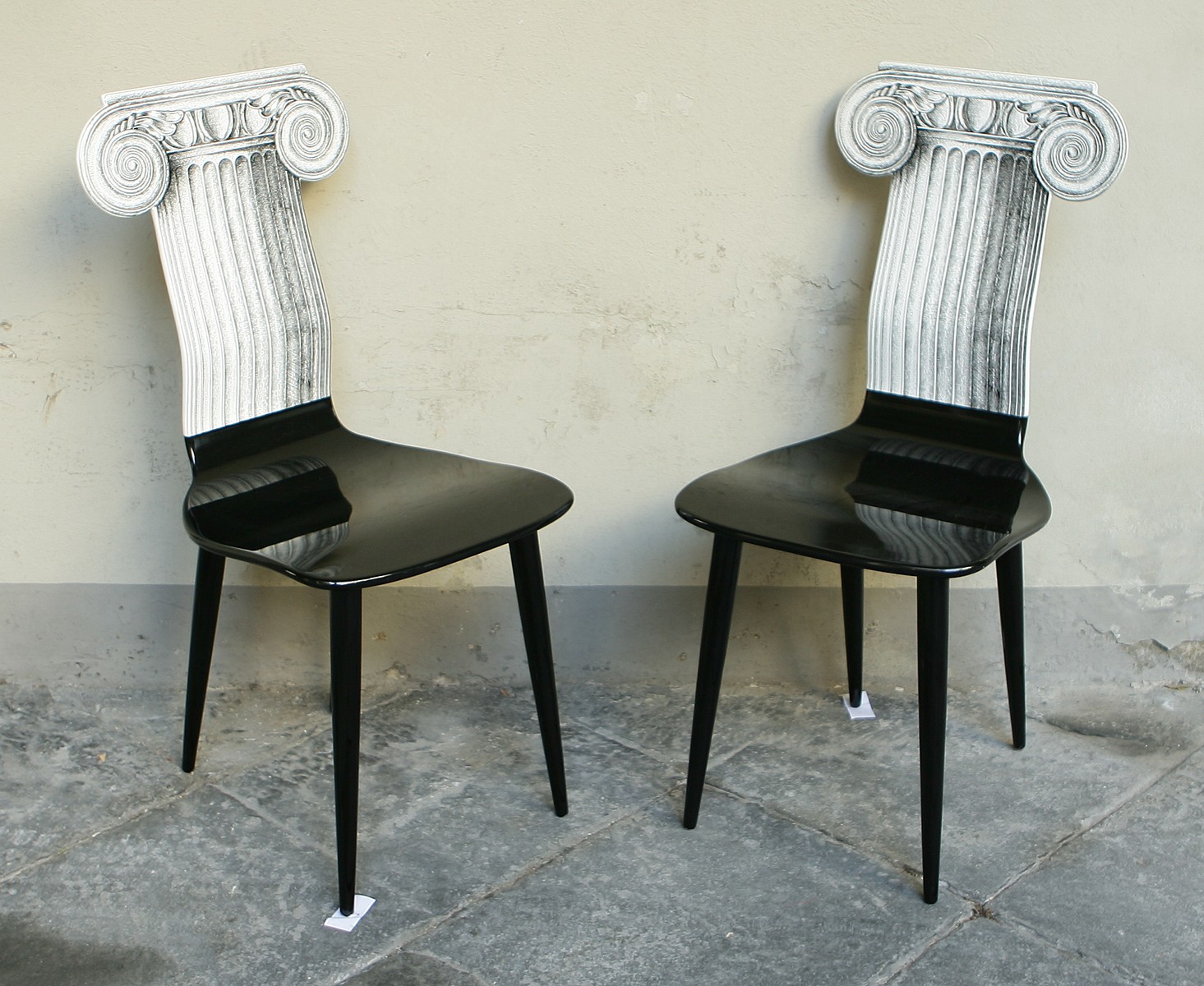 FORNASETTI PIERO (1913 - 1988). Due indimenticabili sedie Capitello Ionico....