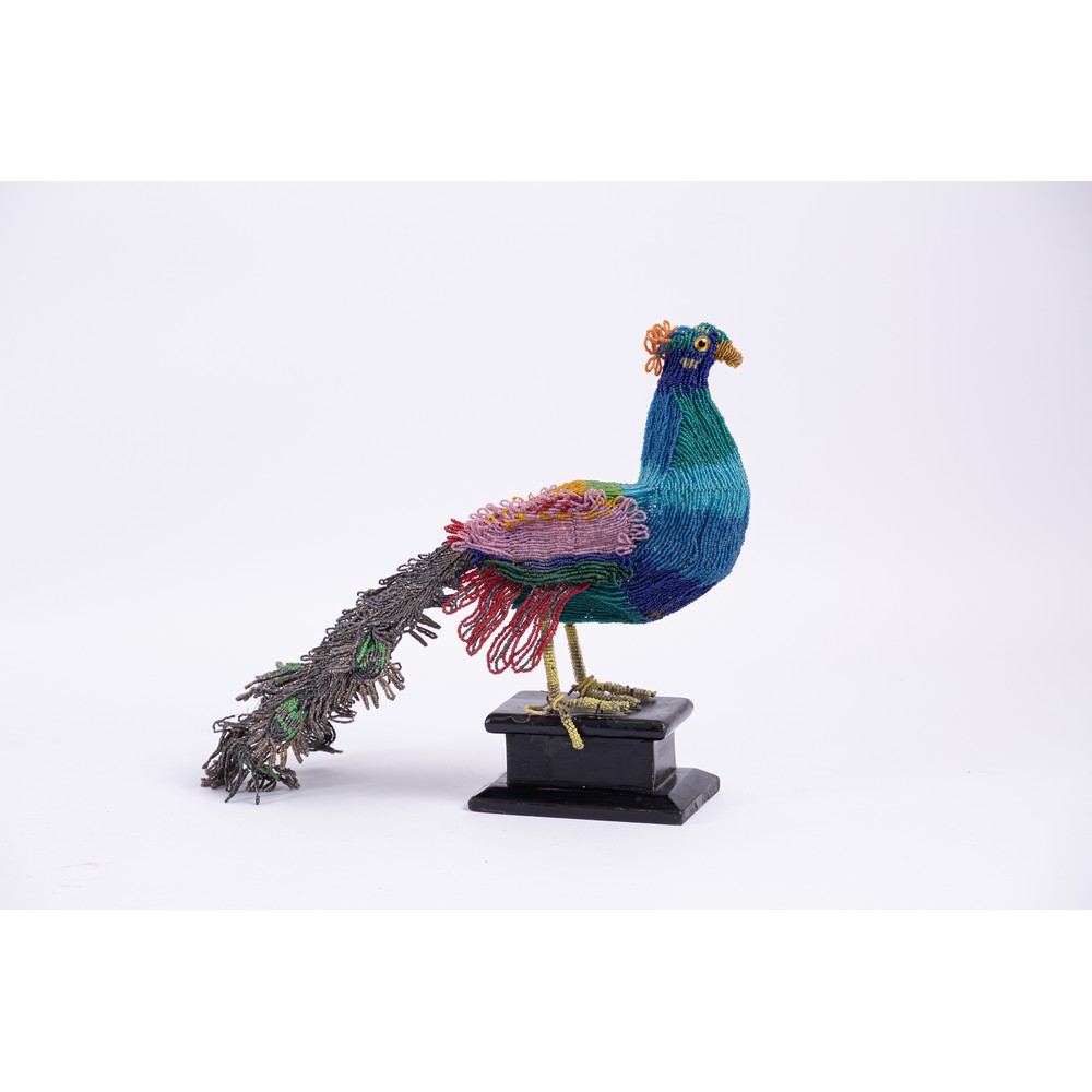 SCULTURA in microperline con base in legno raffigurante "Pavone".