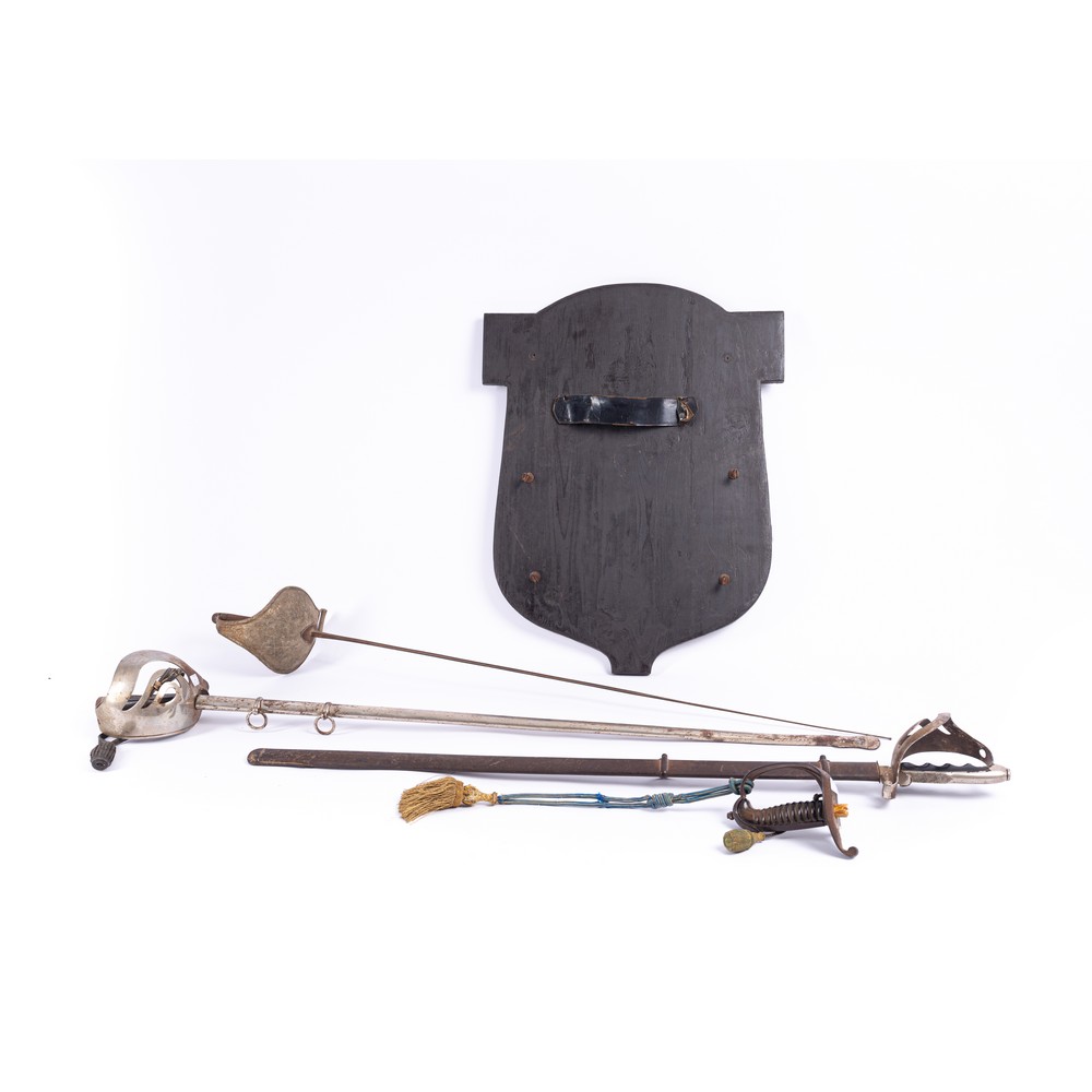 SCUDO IN LEGNO con impugnature di sciabole e fioretto.