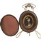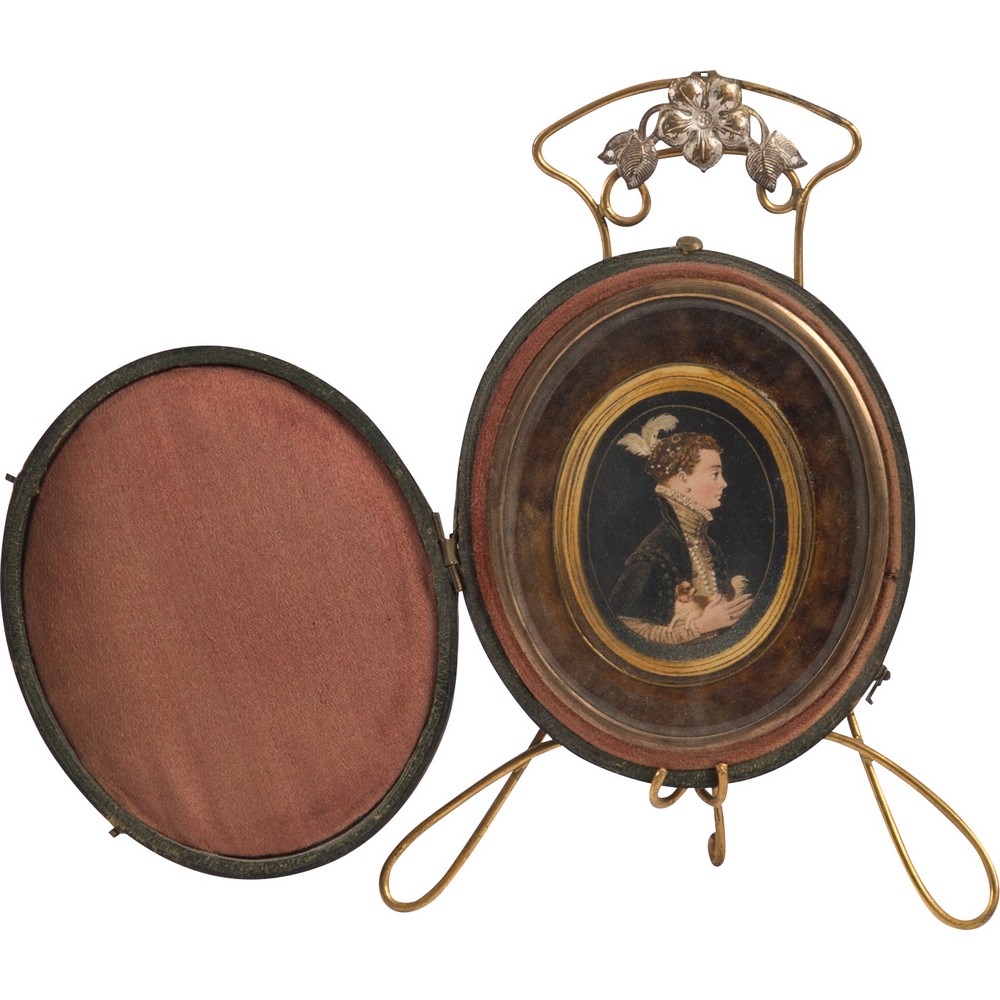 MINIATURA su legno raffigurante 'Nobildonna con cane', di forma ovale entro custodia e sorretto da piccolo cavalletto.