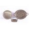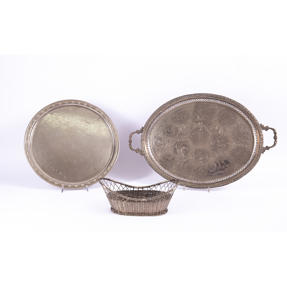 TRE OGGETTI in metallo argentato: cestino, vassoio tondo e vassoio ovale.