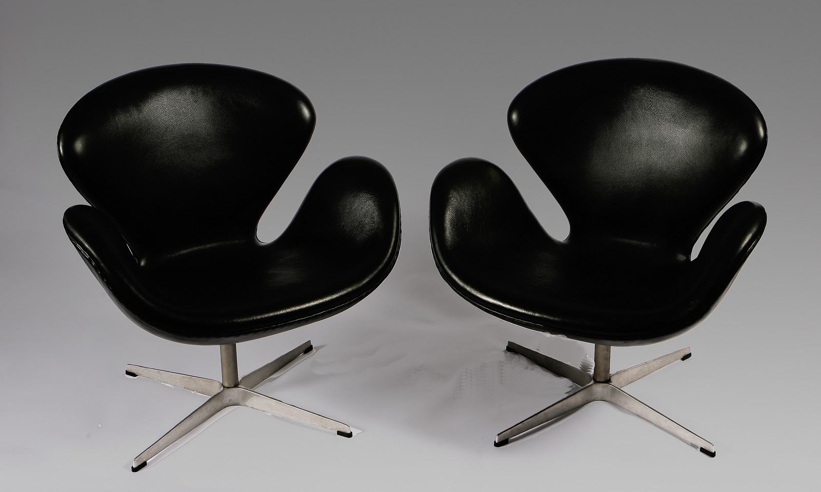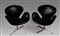 JACOBSEN ARNE. Coppia di swan chair. Couple of Swan chair. Plastica dura e pelle nera. Cm 74x77x68. Coppia di Swan chair, Fritz Hansen, disegnate nel 1958, prodotte nel 1990. Una icona del Design svedese. Base in plastica dura, ricoperta di pelle nera. Couple of Swan chair, Fritz Hansen, designed in 1958, produced in 1990 1958.