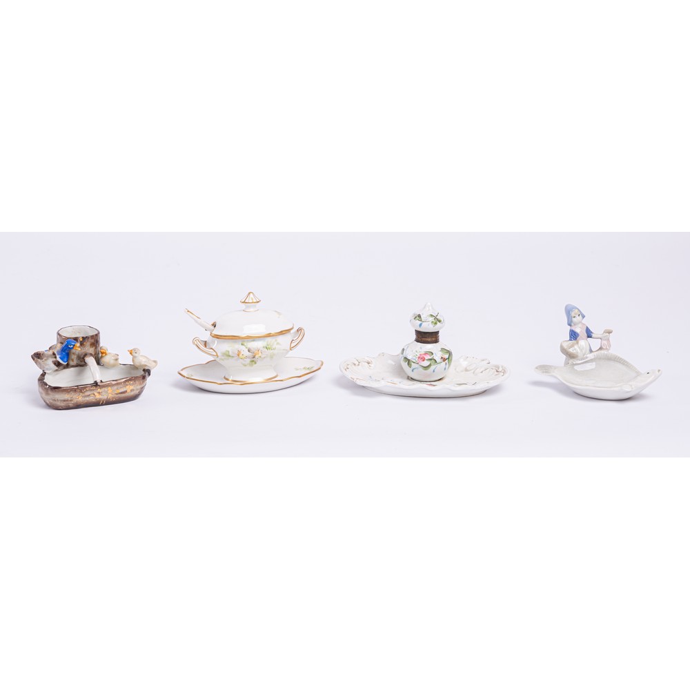 OGGETTI VARI: piccola salsiera con cucchiaino, calamaio, svuotatasche e piccola fioriera in porcellana decorata.