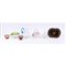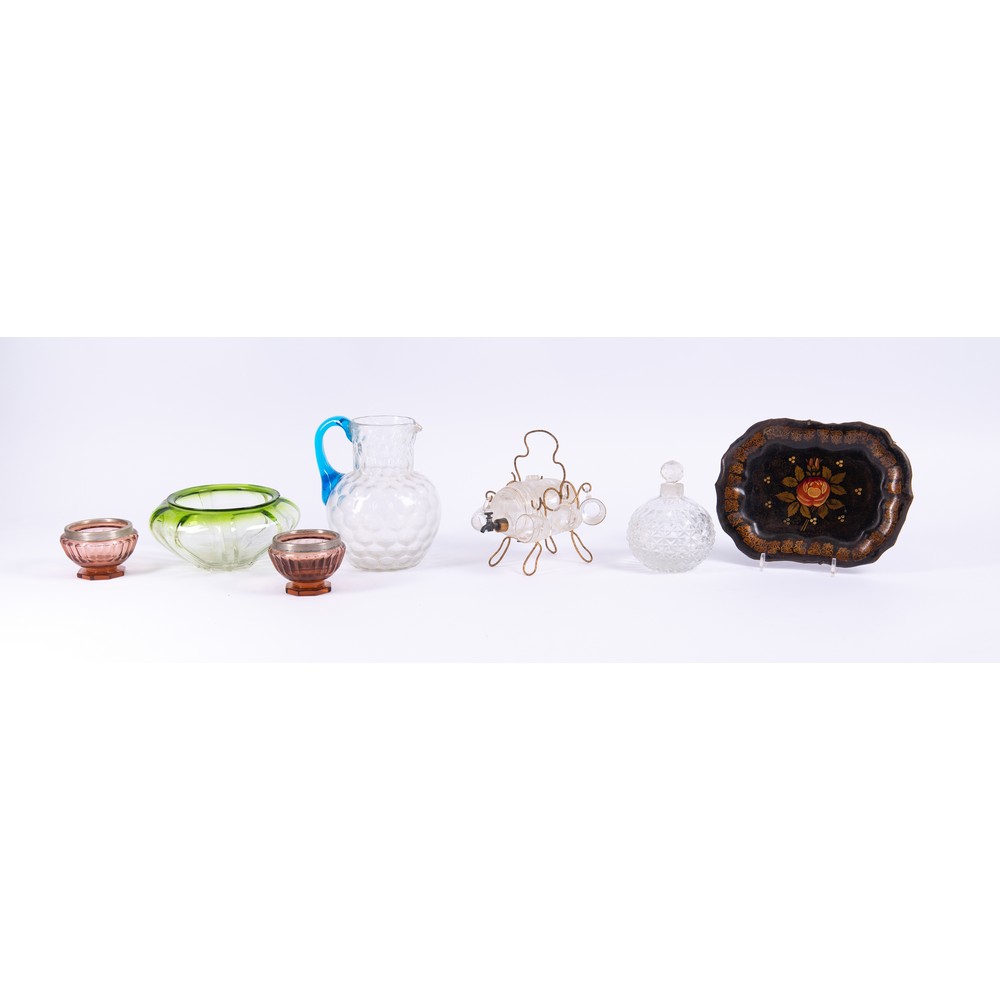 OGGETTI VARI: piccolo vassoio in latta dipinta, brocca e bottiglia in vetro , rosoliera con sei bicchierini in vetro, due ciotoline in vetro e metallo e un centrotavola in vetro.