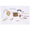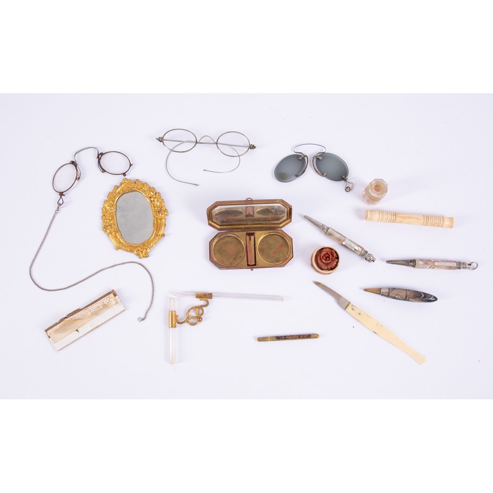 tre OCCHIALINI, due PORTAMATITE in metallo e madreperla, SPECCHIETTO in metallo dorato, COLTELLINO con manico in osso, BOTTIGLIETTA in cristallo, ASTUCCIO in osso e SCATOLINA da trucco.