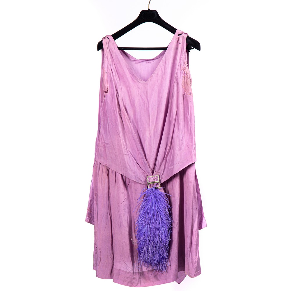 Abito da sera “Charleston” in seta color ciclamino in un pezzo ottenuto da tagli che si incrociano nella parte frontale puntellati da una vistosa scocca con due guarnizioni in jais da cui dipartono pendenti quattro piume di struzzo di color celeste. Ai fianchi bordi di lustrini e jais puntellati dalle finte code.