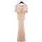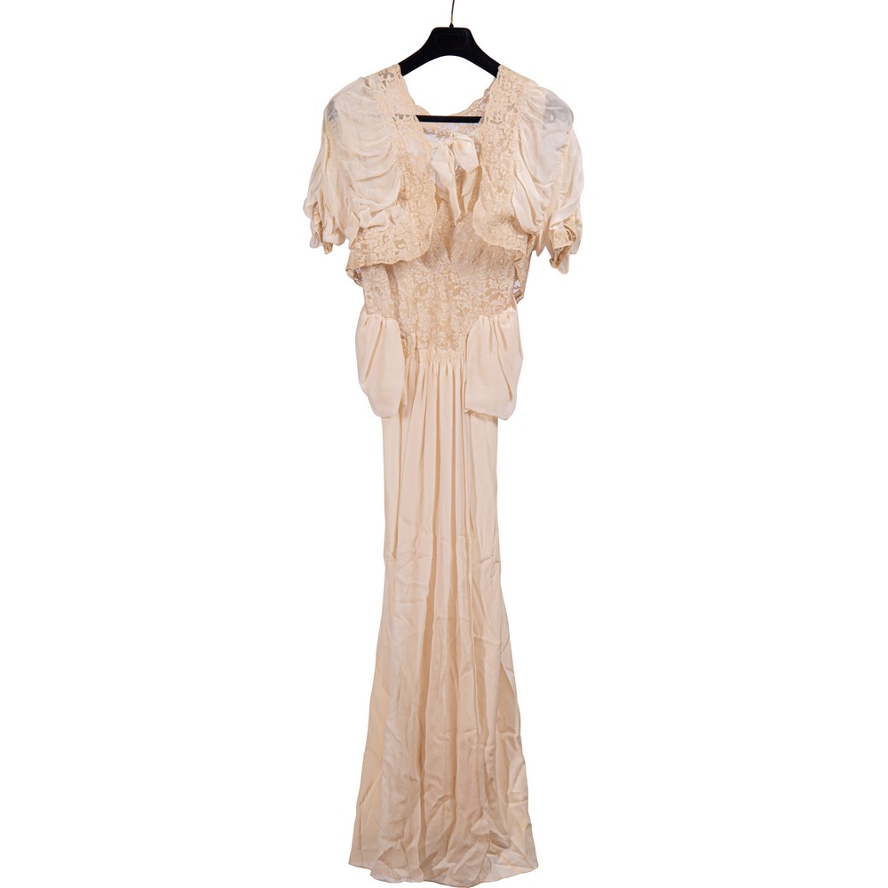 Abito da sera in due pezzi di chiffon color avorio. Corpetto nella parte frontale è interamente rivestito da applicazioni in valenciennes. La chiusura è posteriore. Il punto vita è evidenziato da due ampi volani e da una serie di arricciature che determinano una lunga fascia plissettata verticale, sul davanti l'abito si correda di un corpino a mantellina con apertura frontale fermata da due nastri, essa è interamente in chiffon in analogo colore e arricchito ampie fasce di valenciennes.