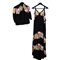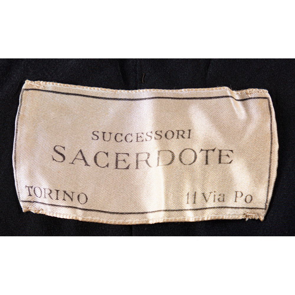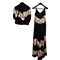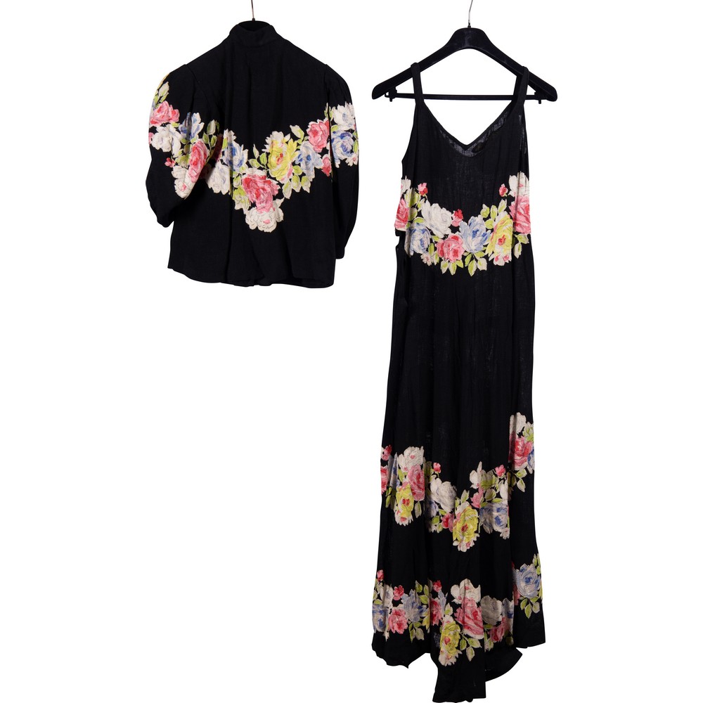 Abito da sera in crepe di seta color nero con scollatura frontale a V. Lungo la vita una vasta bordura floreale con rose anemoni e vari nei colori celeste, giallo, verde e rosso impuntata a decorazione. Analoga bordura in doppia fascia decora la parte inferiore della gonna. Completa una giacchetta con chiusura frontale con otto bottoni foderati nell'analogo tessuto e decorata dalla stessa bordura floreale applicata che dipartendo dal collo contorna le manichette e termina a V sulle spalle.