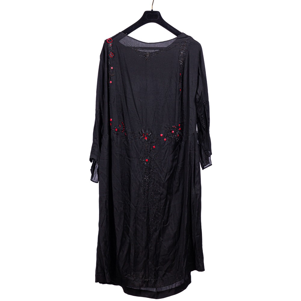 Abito da sera in un pezzo in crèpe di seta color nero unito ad organza in analogo colore decorato da ricami floreali ottenuti da lustrini color rosa, neri e rosso granato. Epoca 1920