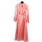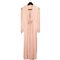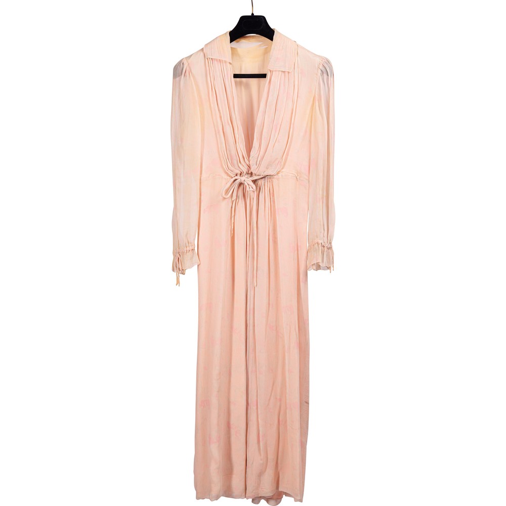 Vestaglia in chiffon color rosa pastello con collo ad ampi riverse e fasce ampie di plissettature sciallate chiusura frontale bottoncini foderati. Misure: Lunghezza tot. 137 cm - Circonferenza tot. 230 cm