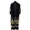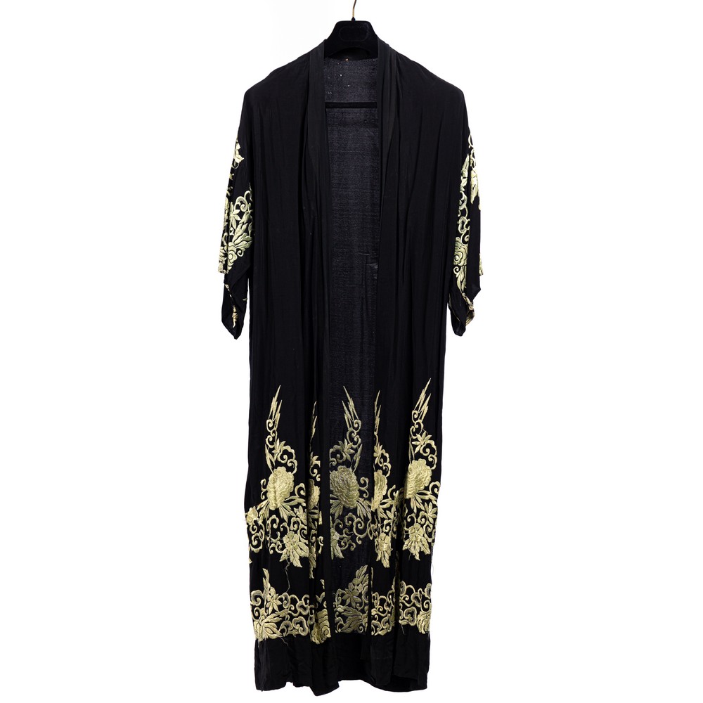 Vestaglia da sera in crepe di seta color nero, taglio alla Chimono. Maniche e parte inferiore sono interamente ricamate con motivi floreali e rabeschi in filo di seta color avorio e grigio. Misure: Lunghezza totale 132 cm - manica 33 - vita 44 - Circonferenza totale 88 cm.
