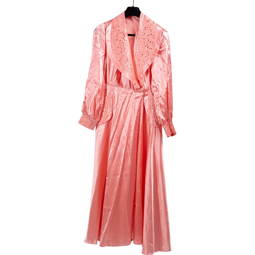 Vestaglia elegantissima vestaglia in raso di seta color rosa. Il collo è sciallato da due ampi rêvers che vedono il raso trapuntato e traforato a motivi floreali contornati da cordoncino di seta color rosa. La stessa lavorazione decora i polsi e le patte delle ampie tasche. Altezza tot.: cm 152 - vita: cm 95 - circ. tot.: cm 240.