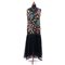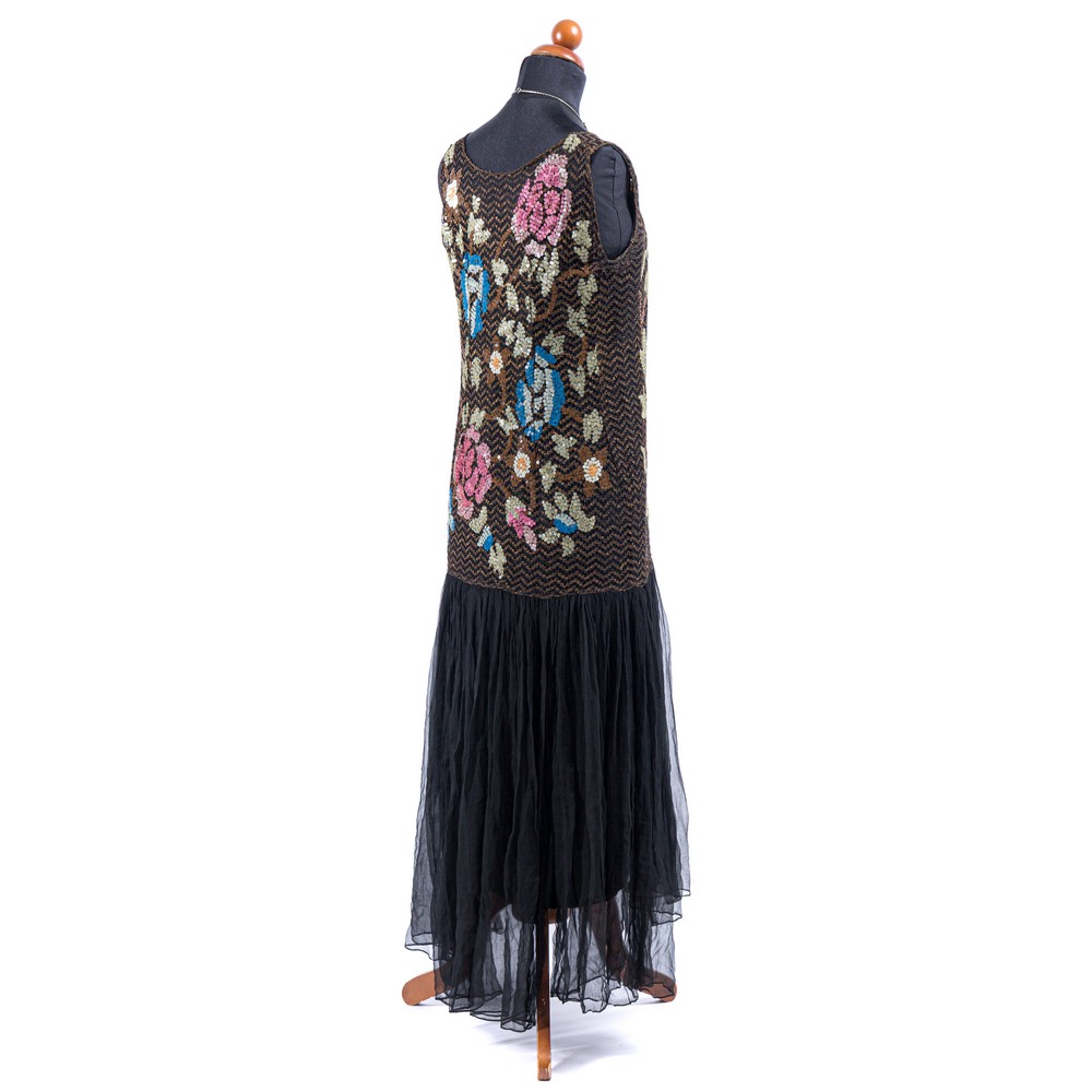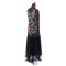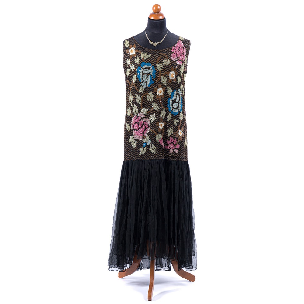 Abito alla Charleston in chiffon di seta color nero plissettato. Dalle spalle alla linea bassa della vita è operato in maglia in filo d'oro che riveste il tulle color nero interamente rivestito da motivi Floreali (tulipani, iris e rose) ottenuti da plissettature color celeste, grigio, blu, rosa ed oro. Manichino in legno.