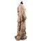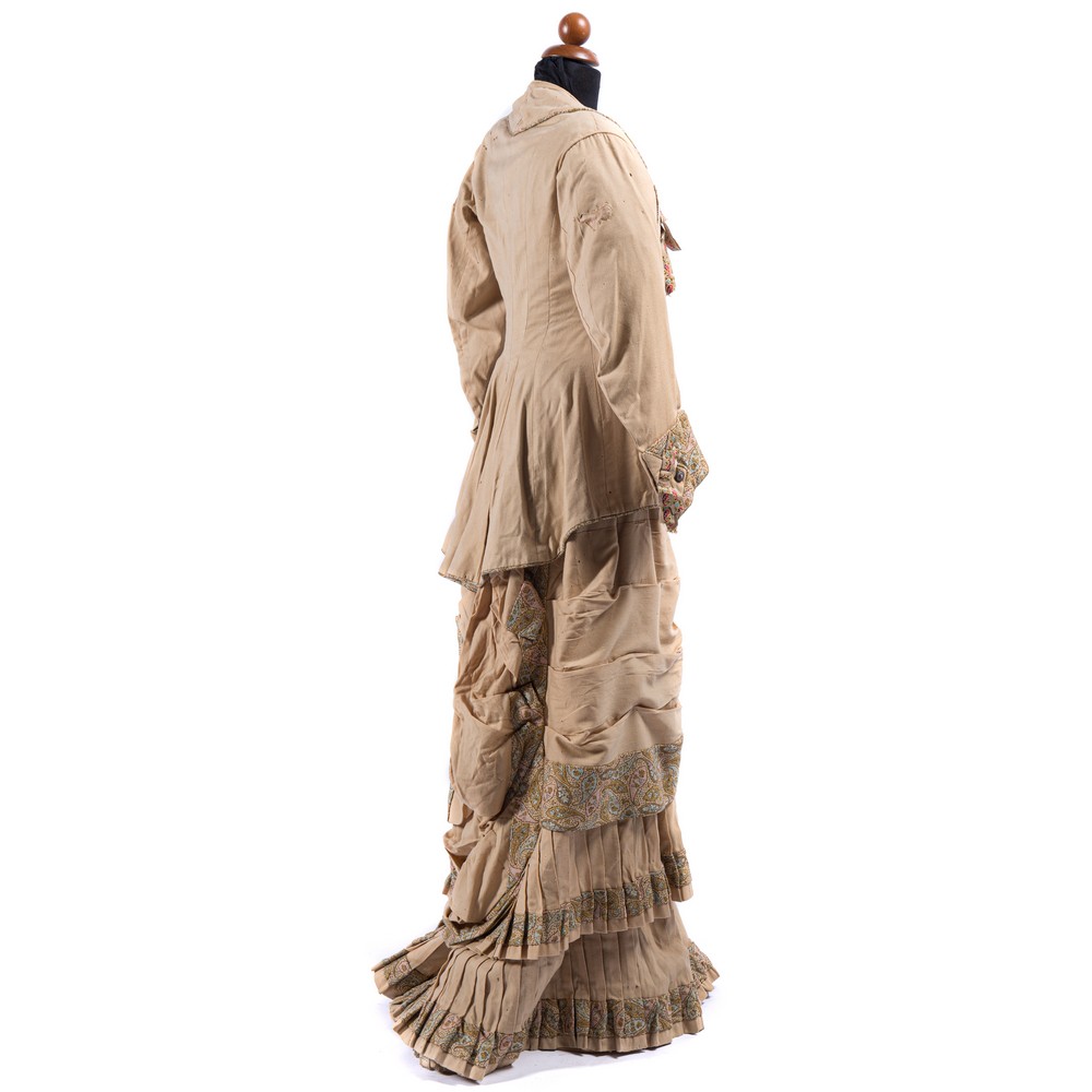 Abito femminile in due pezzi da mattina invernale, in cotone color beige, alternato a cotone operato a motivi floreali nei colori arancio, grigio e oro. La chiusura del corpetto è frontale fornita dodici bottoncini in metalli centrati da pasta vitrea colorata di murano, i paramani puntellati da analoghi bottoni, gonna movimentata da balze e plissettature ottenute con l’incrocio dei due tessuti, possiede nella parte posteriore una movimentata coulisse. Manichino in legno.