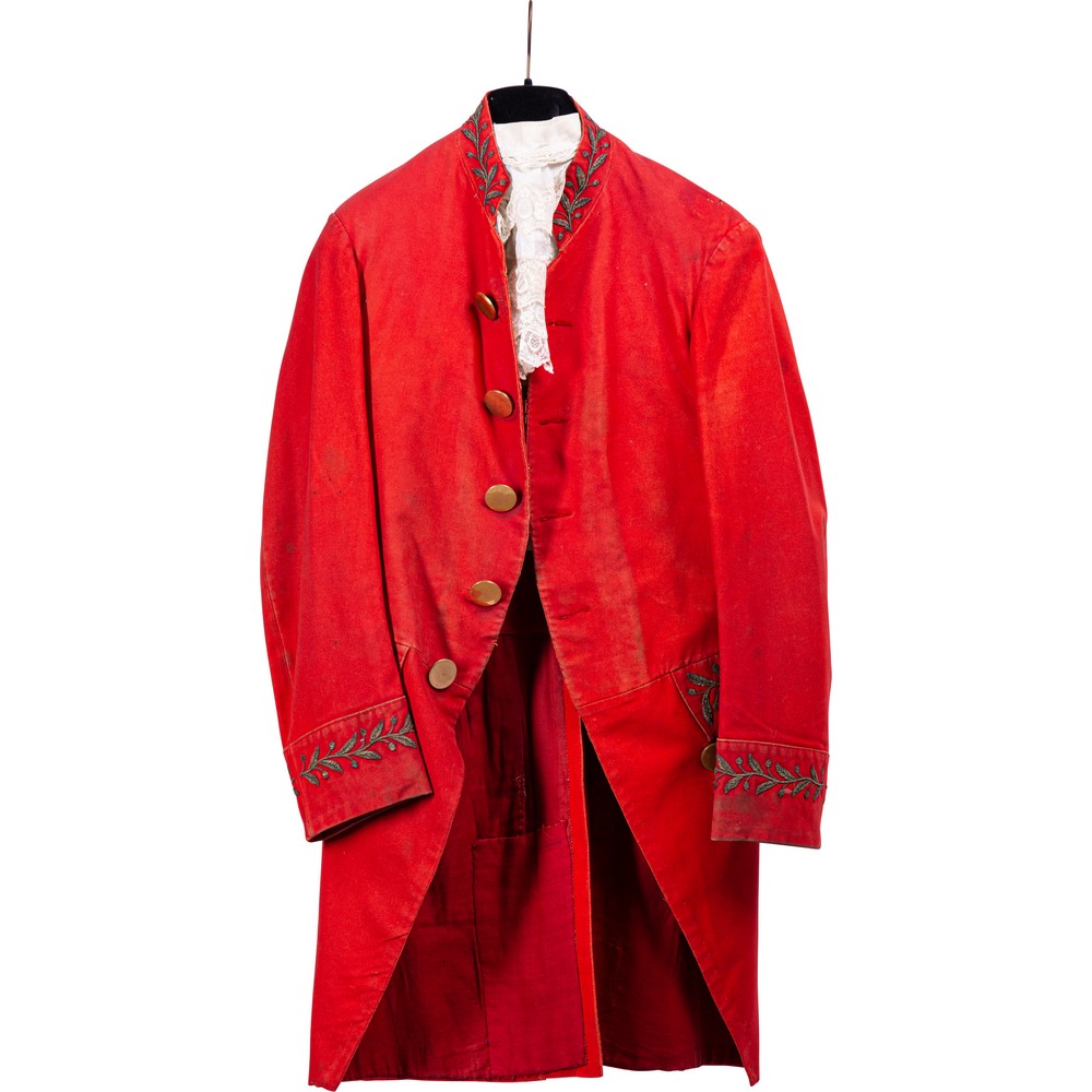 Livrea del Senato Palermitano. Giacca in panno con colletto, orli delle maniche e patte delle tasche ricamati in filo d’argento e d’oro a foglie d’ulivo e pampini. I bottoni sulle mostre in argento, riportano iniziali del Senato Palermitano (S.P.Q.P.). Livree reali usate per la Esposizione Nazionale di Palermo (1891). Livree di Casa Moncada dei Principi di Paternò usate dal Comune di Palermo