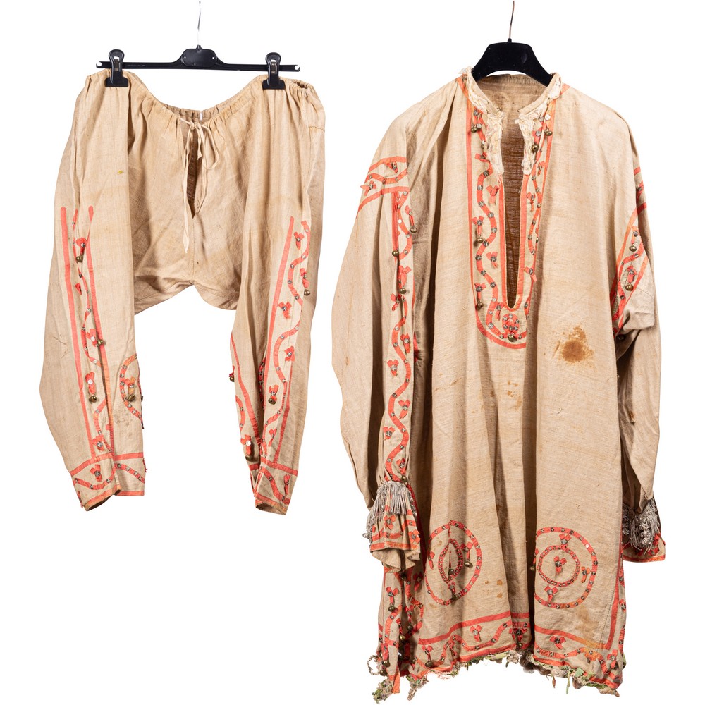 Casacca sonora da fare indossare al “CELERE” servo incaricato di fare luce ai cavalli delle carrozze, precedendoli con una torcia e nel contempo spaventare i gatti. La casacca è in lino, molto ampia fornita di larghe maniche. Essa è interamente decorata nella parte frontale lungo le maniche, nei paramani e lungo il bordo inferiore spaccato lateralmente, da vasti orli di seta color rosa decorati da serpentine in analoga seta puntellate da grosse paillettes argentate. Simmetricamente teorie di piccoli nastrini che sorreggono dei sonaglini, nel pettorale, lungo le maniche, in tutto l'orlo inferiore che tra l'altro è decorato da una bordura di piccoli fiori cerati in seta e motivi in canutiglia d'argento e paillettes, calzoni ampi e allacciati alla vita, sono trattati in analogo modo.