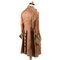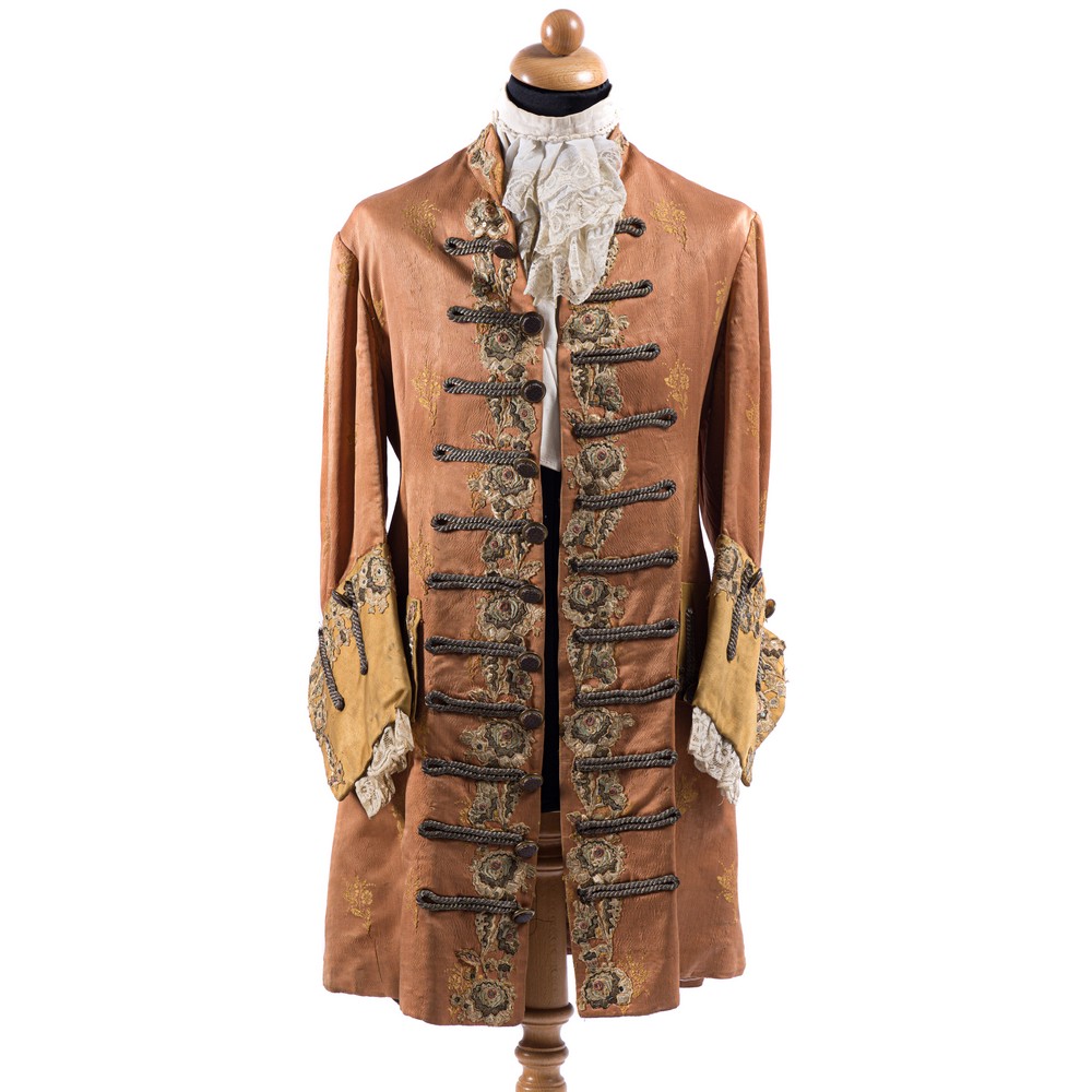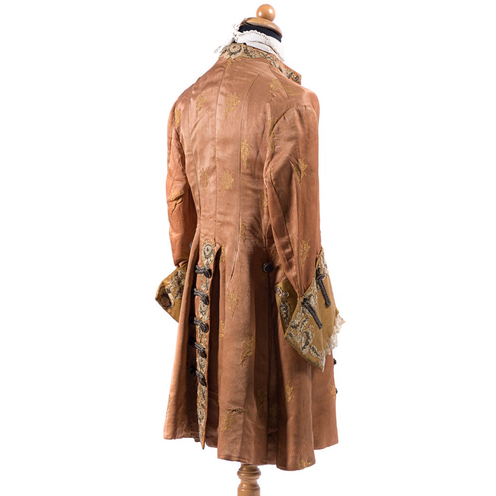 Livrea in gros de tour color salmone con mostre fermate da undici bottoni in bronzo operati e sottolineate da ventidue lembi doppi a cordone di filo d'argento. Le mostre sono interamente decorate insieme al colletto ed ai paramani da inserti floreali applicati ottenuti con ricamo in seta policroma, filo d'argento e paillettes. Paramani in raso di seta color verde - giallo fermati da due bottoni analoghi e i doppi piegoni posteriori fermati anch'essi da due bottoni ai fianchi, la coda decorata con cinque bottoni e applicazioni analoghe alle mostre anteriori. Finte tasche in raso di seta color verde-giallo sagomate e fermate da quattro bottoni e guarnite da analoga decorazione. Fodera in rigatino di cotone color violetto. Manichino in legno.