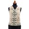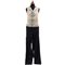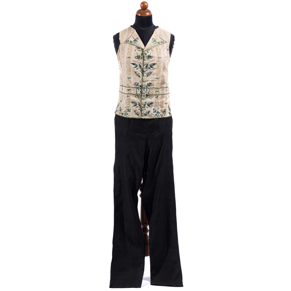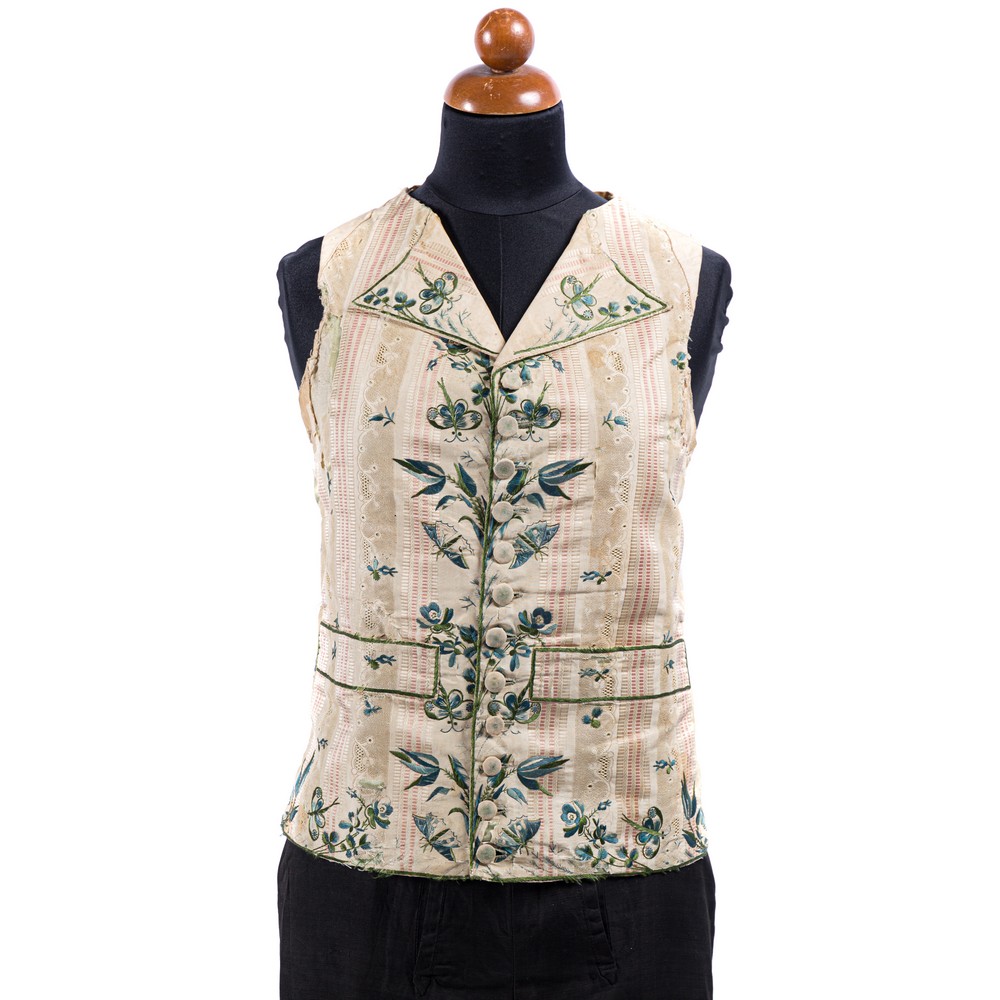 Panciotto maschile color avorio operata e sfilata in senso verticale a fasce di finto plissee, e finte bordure in tulle che emulano la carta da zucchero, chiusura frontale fornita di dodici bottoncini foderati, collo evidenziato da due delicatissimi revers decorati da motivi floreali e due farfalle, ricamati in filo di seta policroma nei colori nero, bleu, celeste e verde. Il revers e tutta la sagoma del panciotto incluse le due taschine sono bordati da un cordoncino di seta color verde oro. La spettacolarità di questo capo, è nella decorazione che si snoda in tutta la parte frontale, interamente ottenuta con motivi floreali vari e vari tipi di farfalle colorate di splendida fattura. La fodera è in seta. I calzoni in cotone finissimo color nero, rarissimi nella reperibilità ed intatti scendono verticali, con frontalmente una patta sagomata fornita di sette bottoni in osso, e due taschini laterali puntellati da due bottoncini in osso. Nella parte posteriore,2due bottoni analoghi puntellano la vita. Manichino in legno.