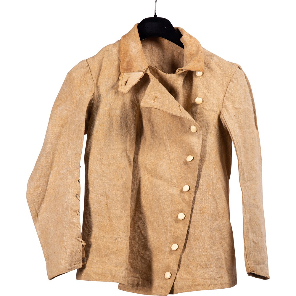 Casacca per scherma in Rigatino di cotone pesante, chiusura frontale laterale con nove bottoni in bachelite color beige.