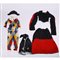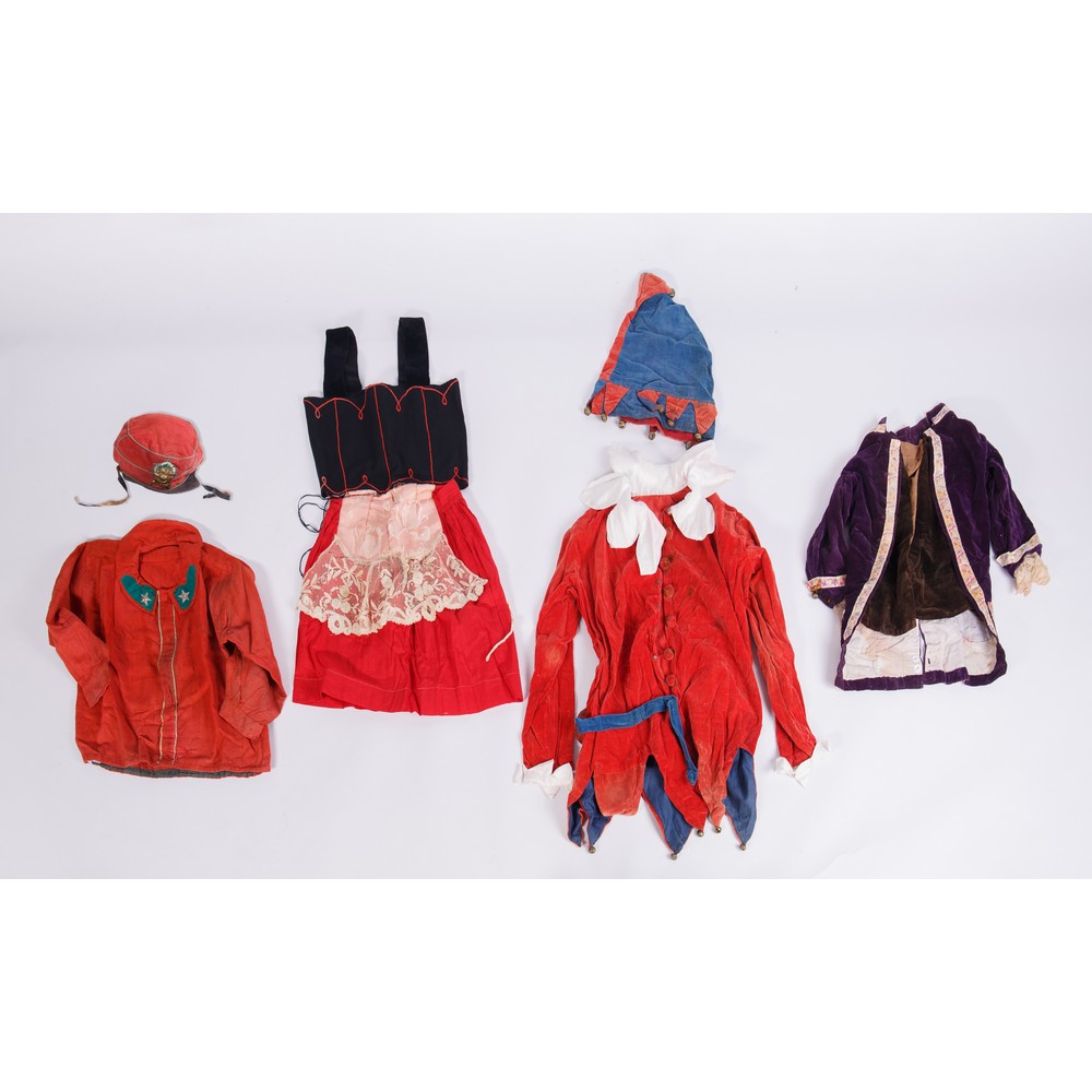 Veste da giullare in vellutino color rosso con apertura frontale fornita di sette bottoni foderati, colletto e maniche arricchite da grandi ritagli in lino bianco, cintura in velluto color blu puntellata ai fianchi da due coccarde anche esse blu e rosso, cappuccio in velluto rosso e blu, adorno di spioventi con nacchere a sonagli in rame. Epoca 1880.