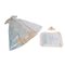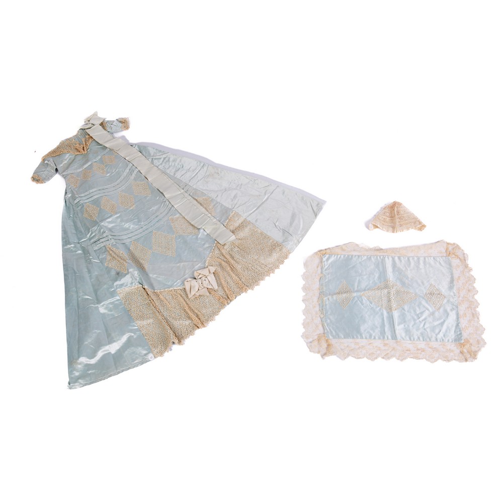 Vesta maschile da battesimo in raso di seta color celeste acqua con la parte frontale interamente decorata da tre ordini di plissettature orizzontali e tredici inserti a rombo ottenuti con trine. Pettorina plissettata in fasce verticali. Trine contornano il girocollo puntellato da un'elegante nastro di seta. Chiusura posteriore fornita di tre bottoncini in madreperla. Nella parte terminale grande balza di trina puntellata da una scocca di seta. Piccola cuffia in merletto e copri cuscino in raso di seta color celeste acqua, decorato da tre rombi di trine e bordura di pizzo di valenciennes.