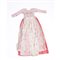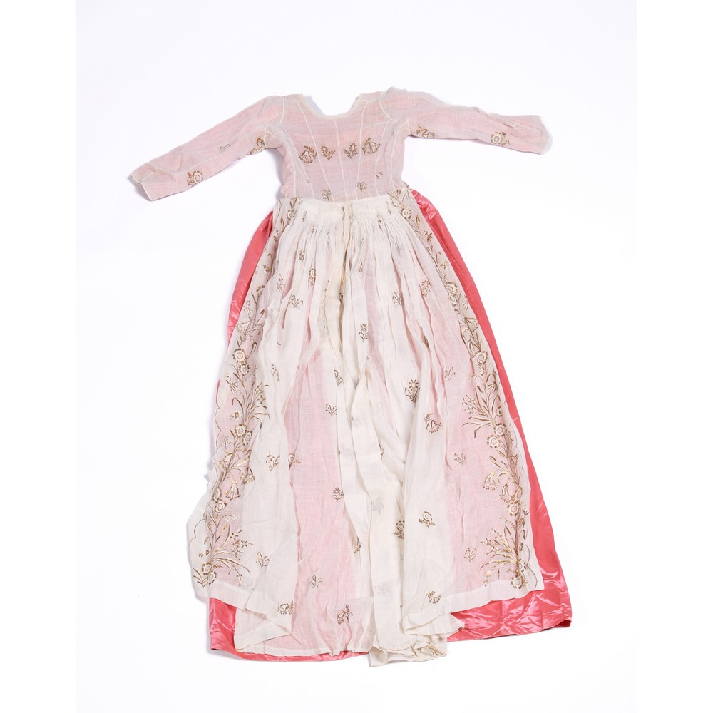 Abito femminile da gala in raso di seta color rosa rivestito nella parte frontale, nei lati e nelle spalle da decorazioni a motivi floreali ottenute da ricamo in filo di seta color bianco, filo d'oro e canutiglia schiacciata d 'argento d 'orato. Epoca 1800.