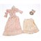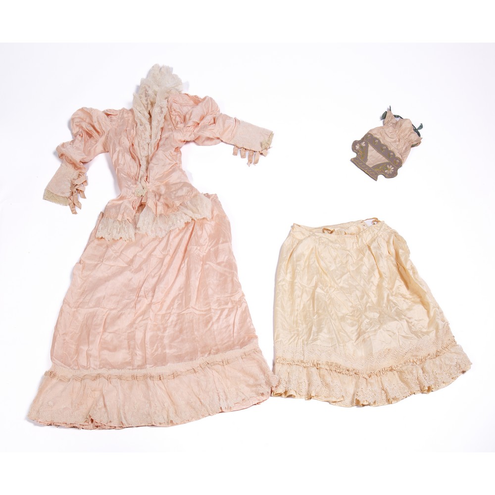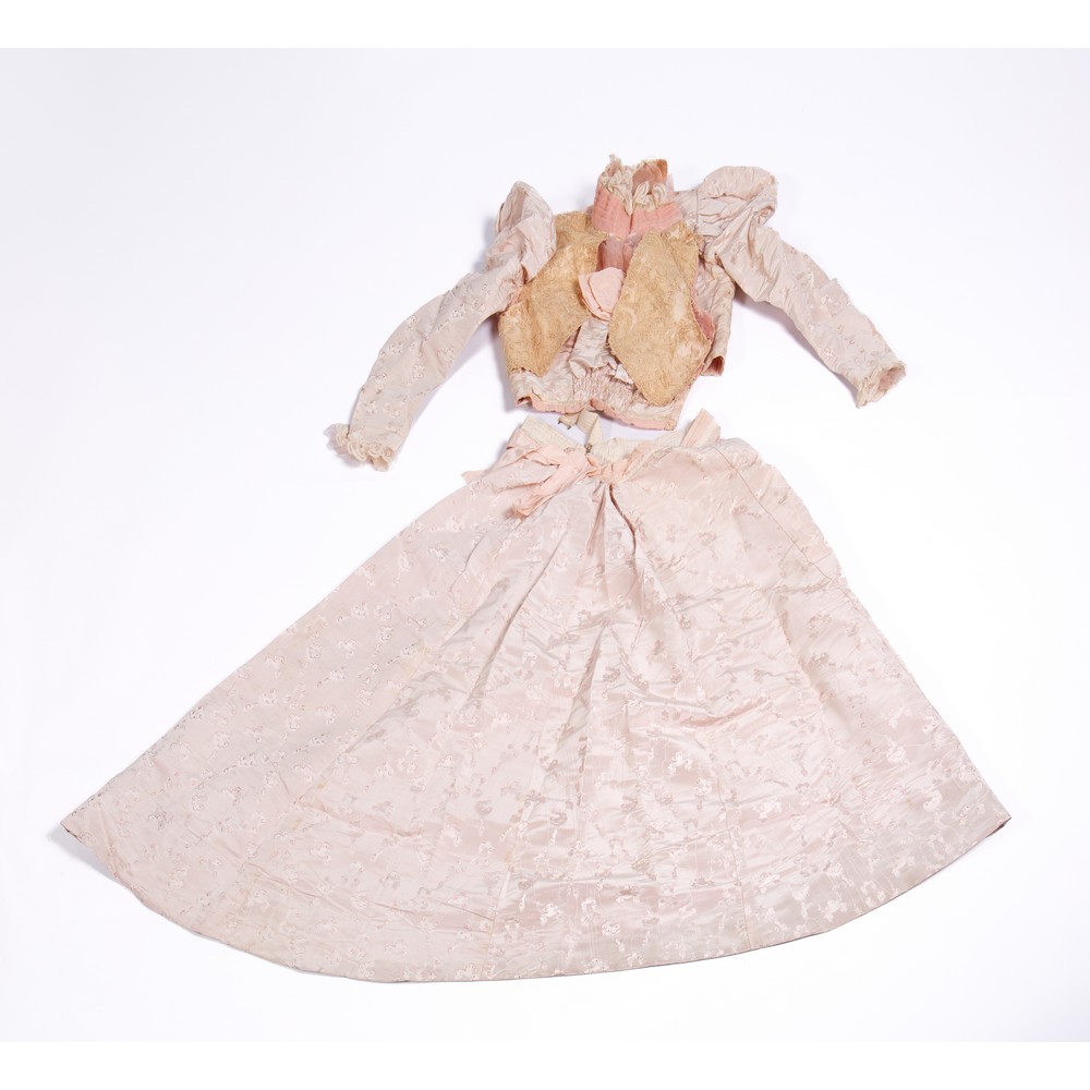 Abito femminile estivo da mattina in due pezzi in seta pura color rosa cipria. Corpetto sagomato con sette bottoni e due orli a revers di pizzo operato a mano. Punto vita chiuso da una scocca a piccola farfalla. La parte posteriore, plissettata con coulisse puntellata da una piccola coda di trine. Maniche con grossa rigonfianza a cosce di montone, paramani con bordatura di pizzo e con quattro scocche in gros di seta. Gonna con ampie frange e bordata da un ampia fascia di tulle operato che riveste una balza plissettata. Sotto gonna decorato da bordure di ventaglietti, ricami e plissettature. Epoca 1875. Misura corpetto: Lunghezza tot. cm 67, Vita cm 68, Maniche cm 51 - Misure gonna: altezza totale 89 circonferenza totale 250.