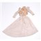 Abito da posa in due pezzi in taffetà operato a motivi floreali color bianco e avorio. Colletto rigido adornato da pizzo di valenciennes, scocca in raso color rosa sul petto. Gonna cade dritta con una leggerissima tournure posteriore. Epoca 1880-1888.