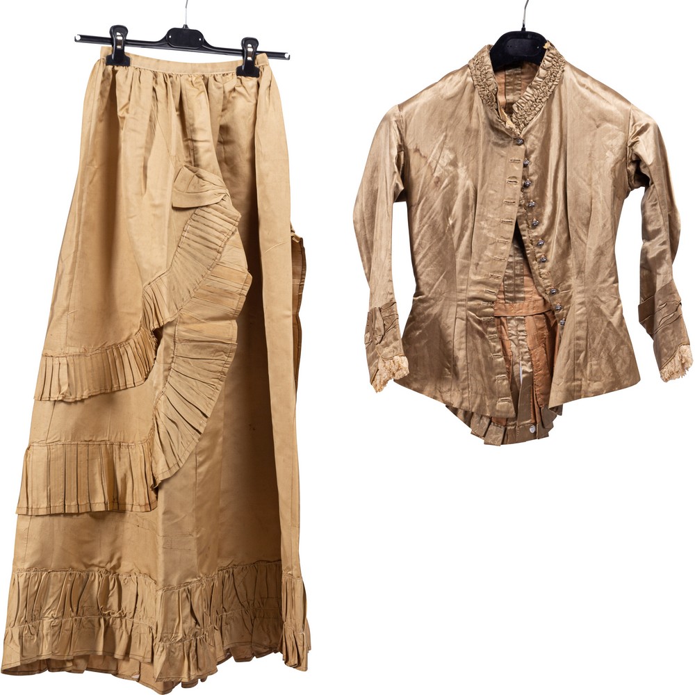 Abito da passeggio in due pezzi in taffettà color nocciola - oro in effetto cangiante, collo evidenziato da arricciature a ventaglietto dello stesso tessuto, gonna movimentata da tre balze puntellate da scocche. Epoca 1875.