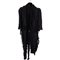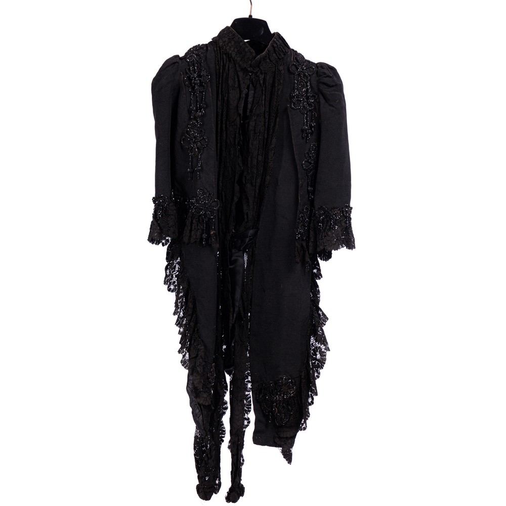 Mantella alla pellegrina interamente in gros dal taglio movimentato da due fasce verticali sul davanti e mantellina a copri maniche sulle spalle. Chiusura frontale fornita di sette ganci e rivestita da fasce di arricciature in pizzo meccanico. Dappertutto applicazioni di grossi cordoni floreali in coralline color nero alternate a fasce di pizzo meccanico. Epoca 1890.