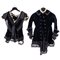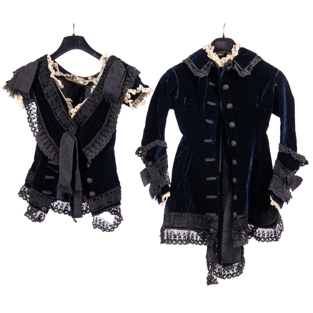 Una giacca ed un corpetto in velluto di seta blu scurissimo, guarnite con trine lungo il collo e sulle maniche, orli della giacca e del corpetto in pizzo Valenciennes nero, scocche in raso di seta nero, chiusure frontali con otto bottoni. Epoca 1880.