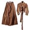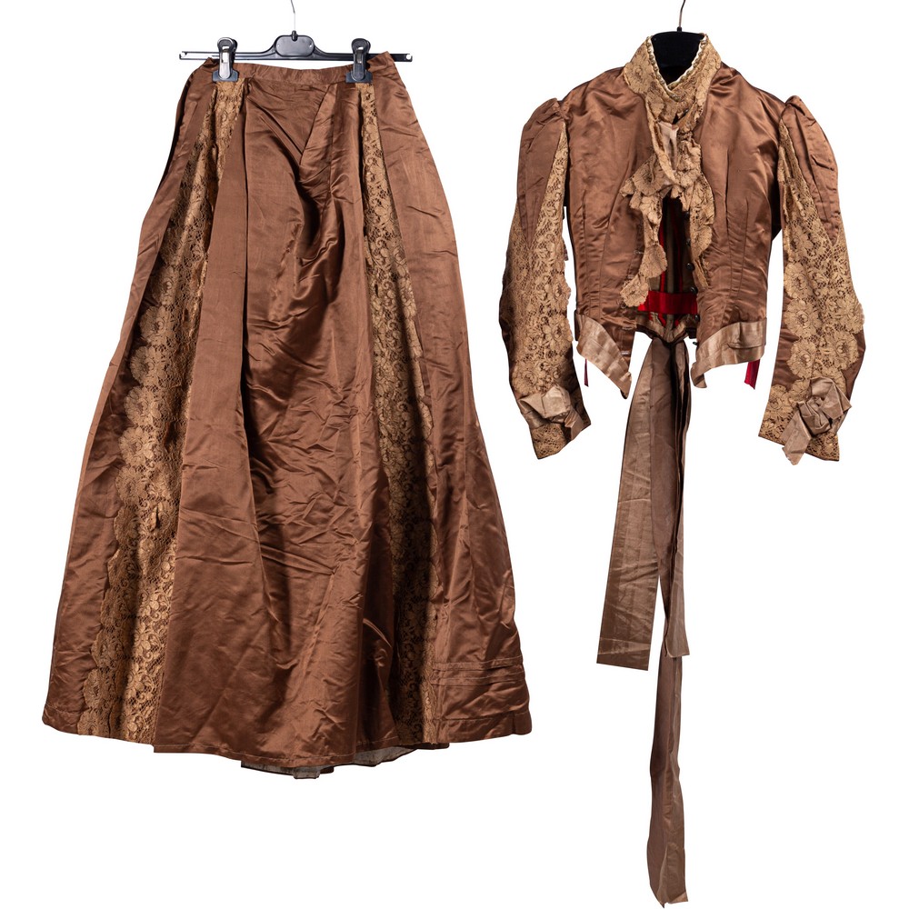 Abito femminile in due pezzi in raso color nocciola, corpetto arricchito da una vasta fascia di valenciennes tutto color ecrù, che contorna anche ampiamente le maniche. Il colletto è guarnito da una passamaneria in filo d’argento e palline di vetro. Il punto vita è contornato da un lunghissimo nastro di seta color ecrù. La gonna cade diritta, bordata a intervalli da due vasti inserti di valenciennes.